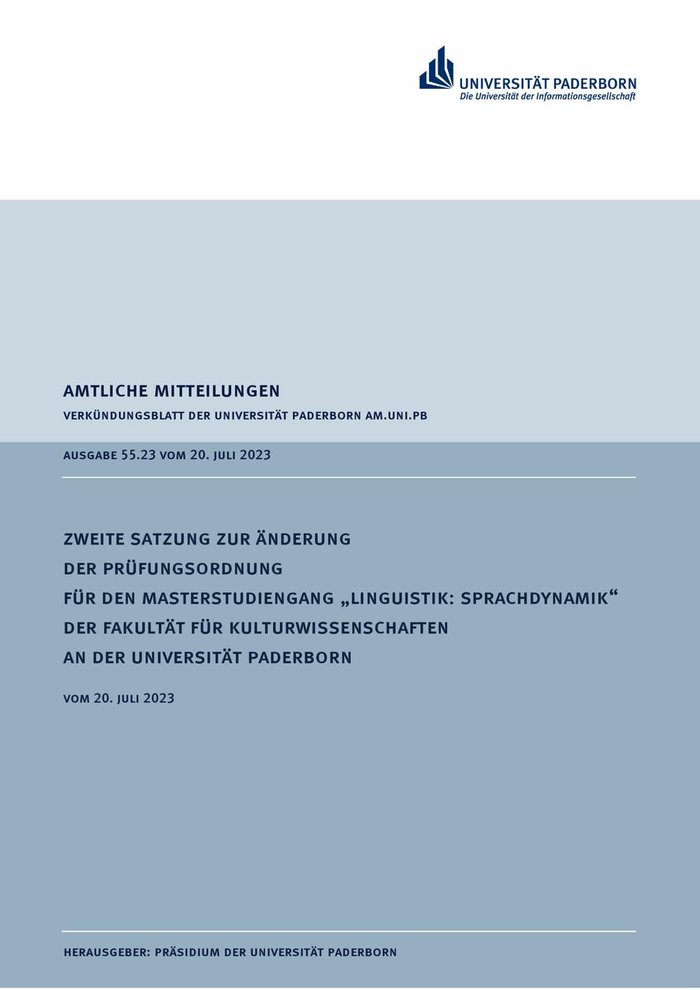 Zweite Satzung zur Änderung der Prüfungsordnung für den Masterstudiengang „Linguistik: Sprachdynamik“ der Fakultät für Kulturwissenschaften an der Universität Paderborn : vom 20. Juli 2023