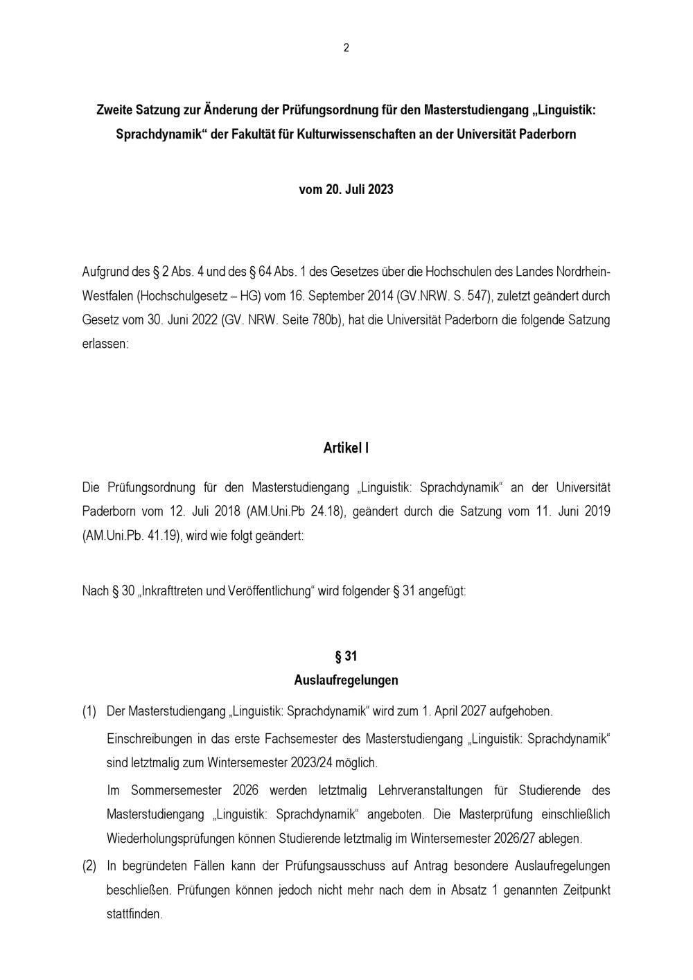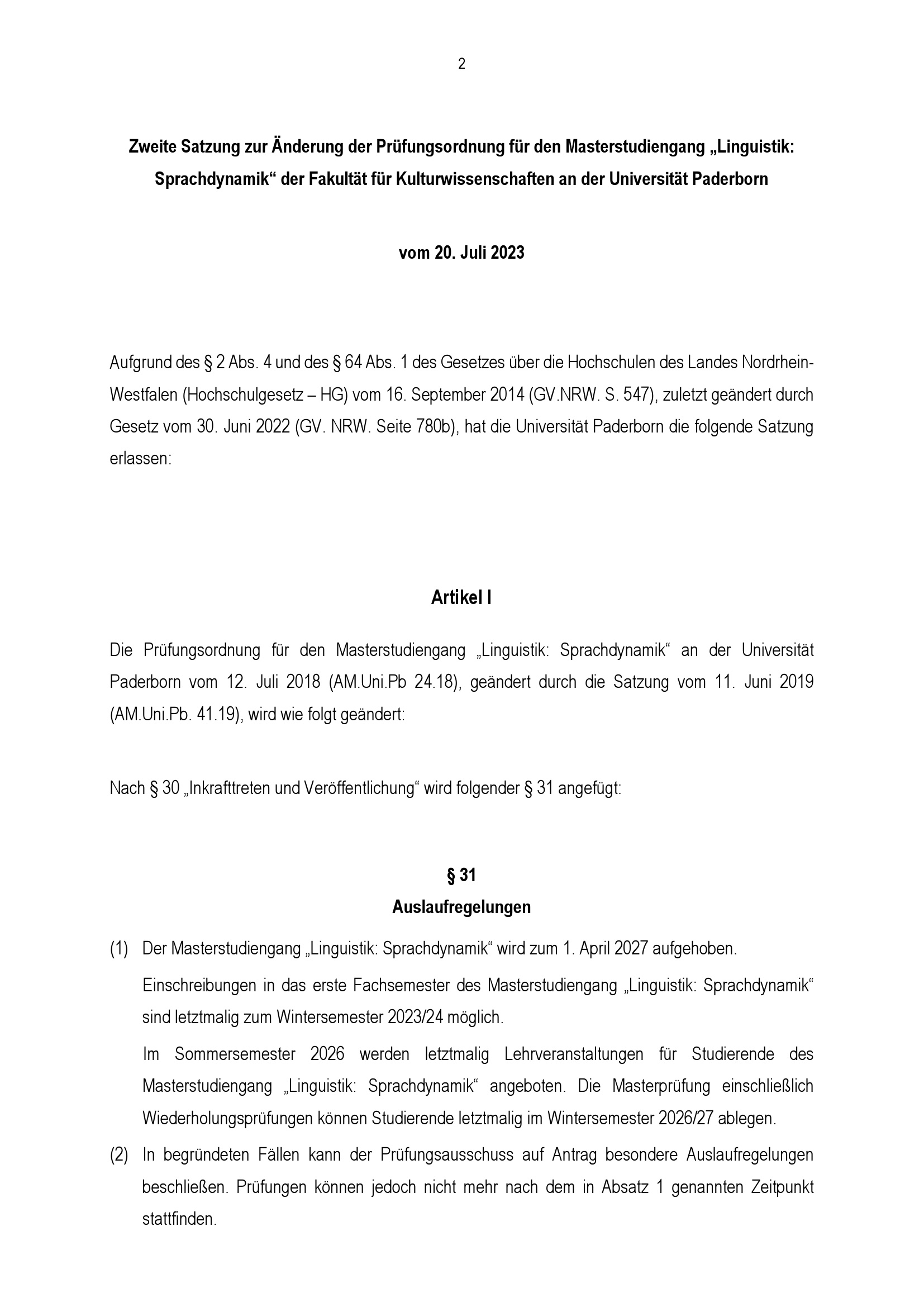 Zweite Satzung zur Änderung der Prüfungsordnung für den Masterstudiengang „Linguistik: Sprachdynamik“ der Fakultät für Kulturwissenschaften an der Universität Paderborn : vom 20. Juli 2023