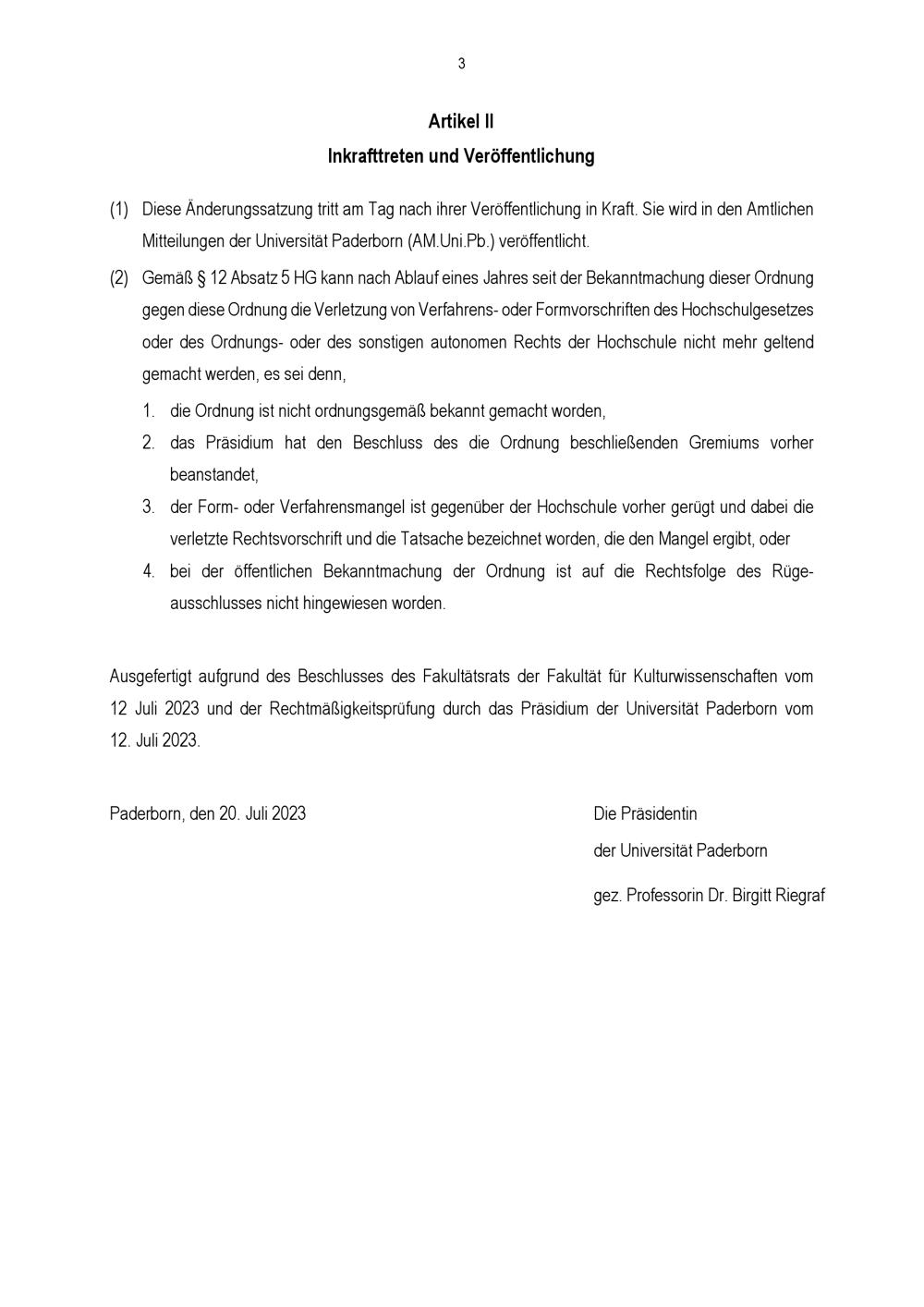 Zweite Satzung zur Änderung der Prüfungsordnung für den Masterstudiengang „Linguistik: Sprachdynamik“ der Fakultät für Kulturwissenschaften an der Universität Paderborn : vom 20. Juli 2023