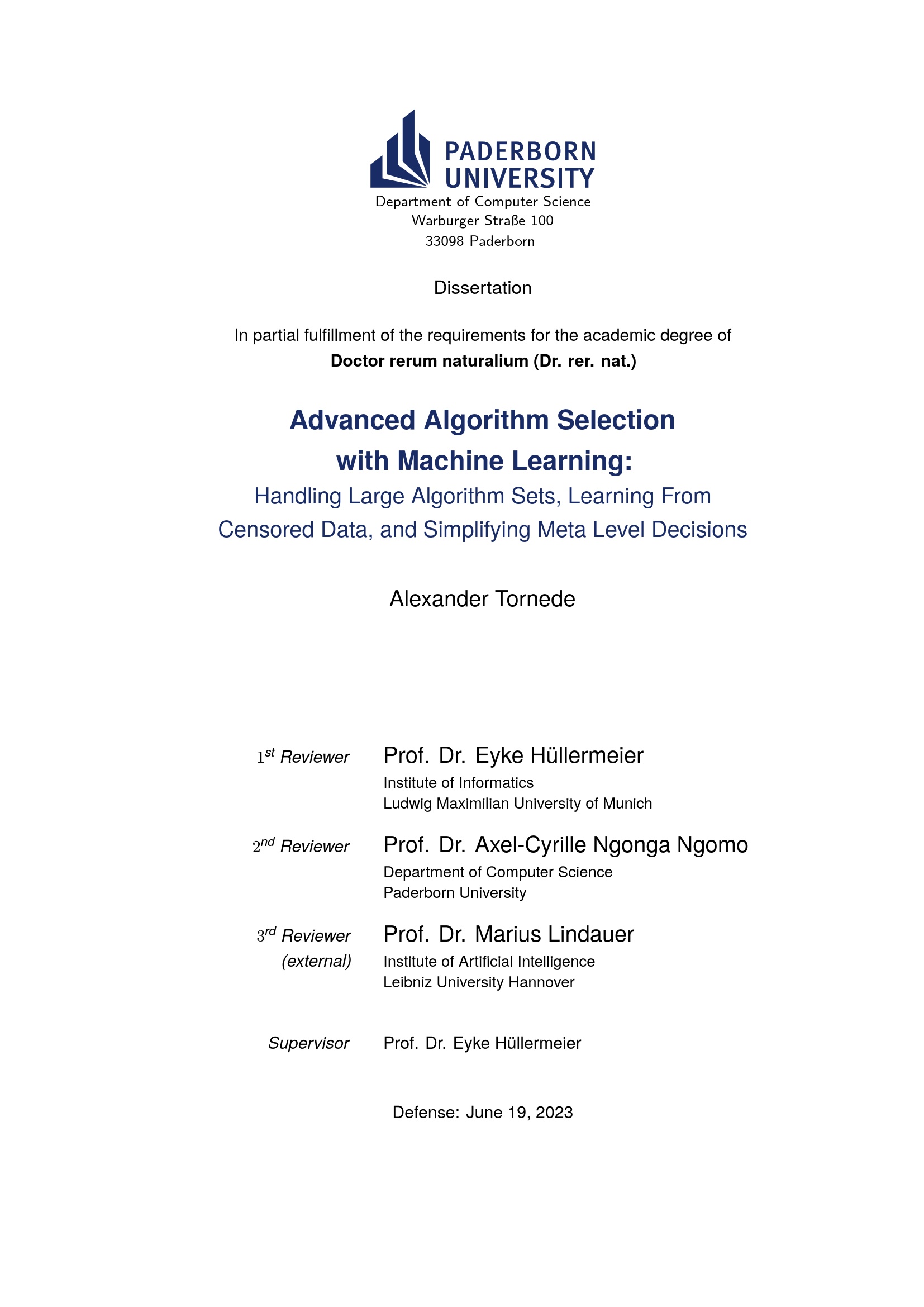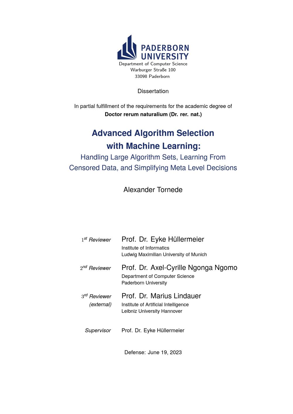 Advanced Algorithm Selection with Machine Learning : Handling Large Algorithm Sets, Learning From Censored Data and Simplifying Meta Level Decisions / Alexander Tornede ; 1st Reviewer Prof. Dr. Eyke Hüllermeier, 2nd Reviewer Prof. Dr. Axel-Cyrille Ngonga Ngomo, 3rd Reviewer Prof. Dr. Marius Lindauer