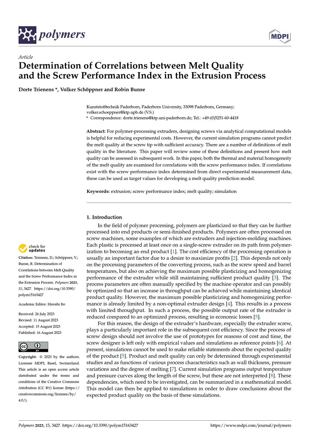 Determination of correlations between melt quality and the screw performance index in the extrusion process / Dorte Trienens, Volker Schöppner and Robin Bunse