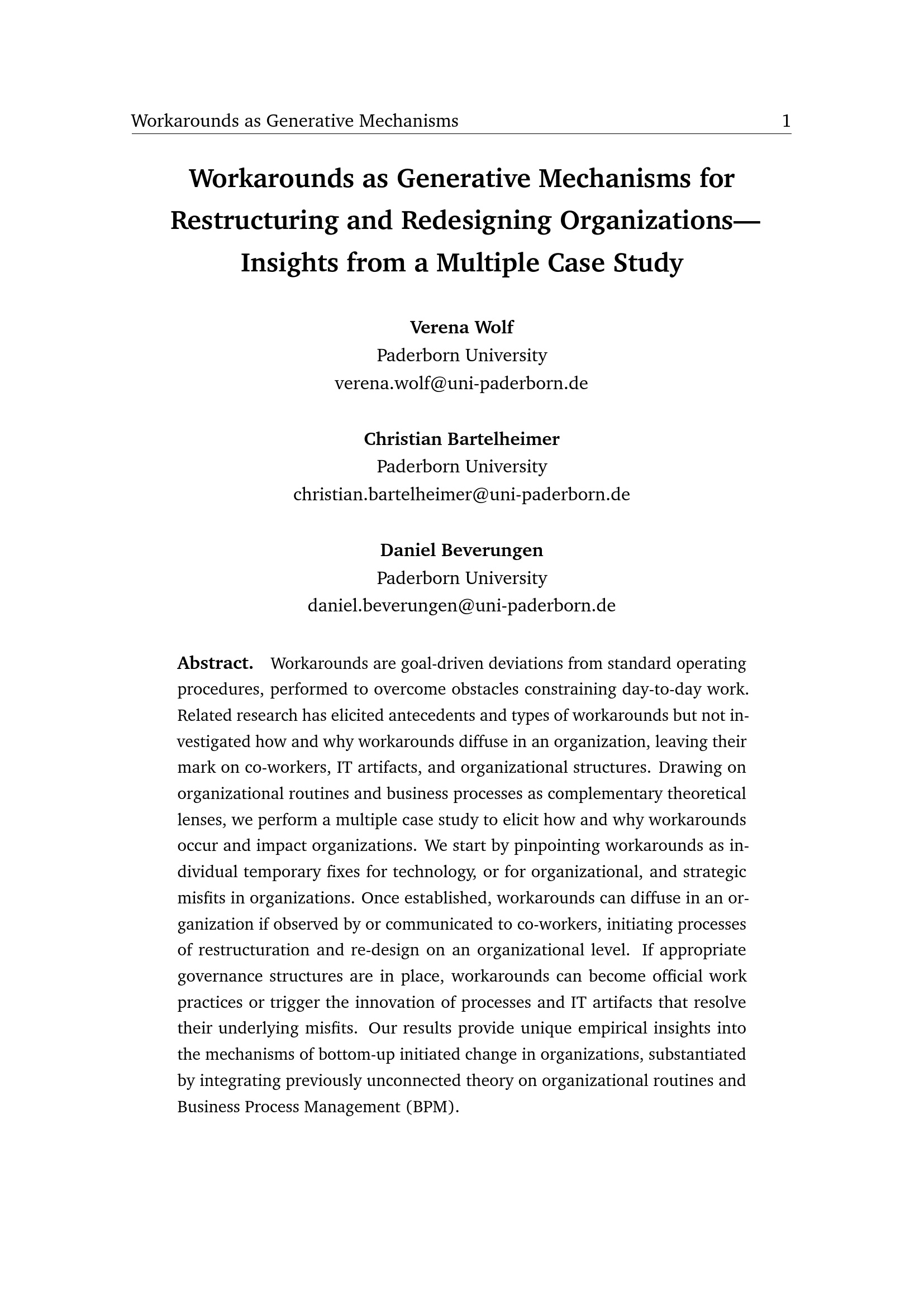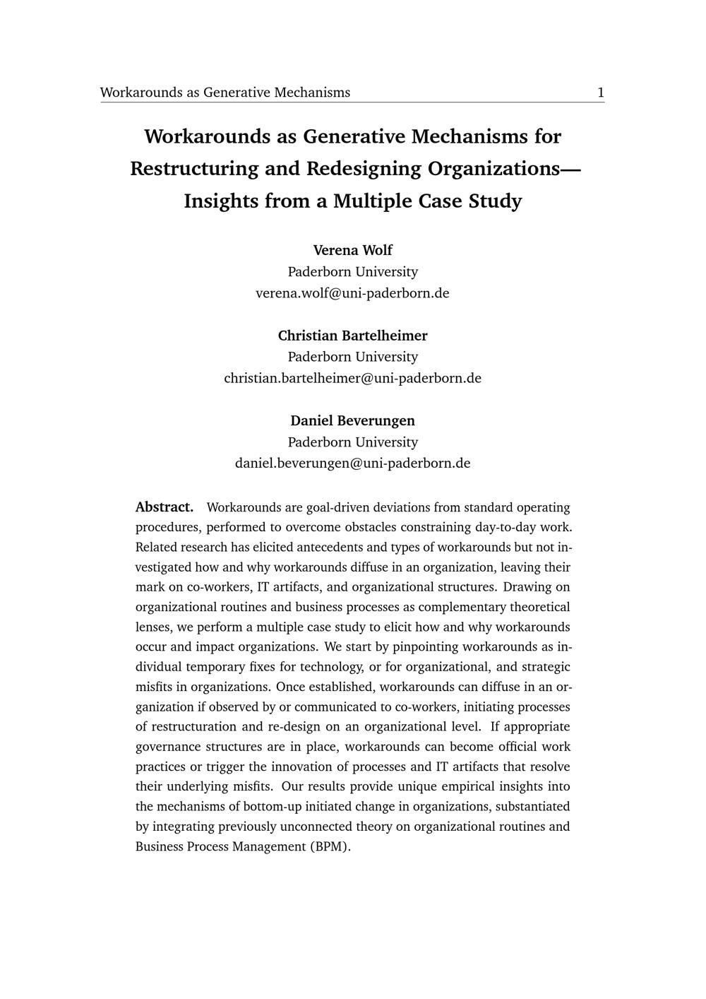 Workarounds as generative mechanisms for restructuring and redesigning organizations : insights from a multiple case study / Verena Wolf, Christian Bartelheimer and Daniel Beverungen