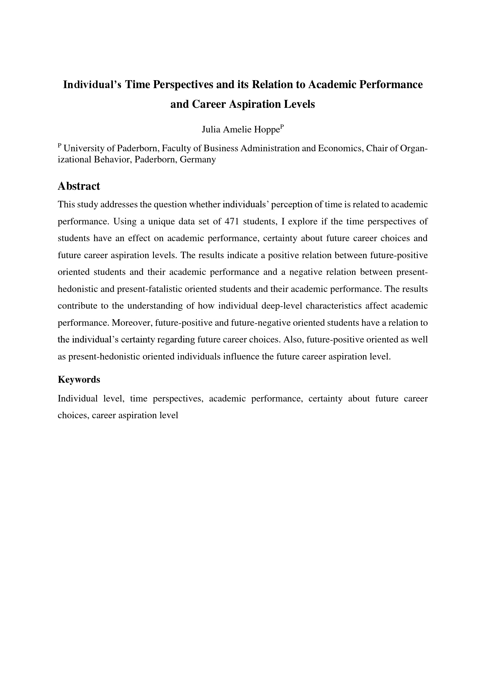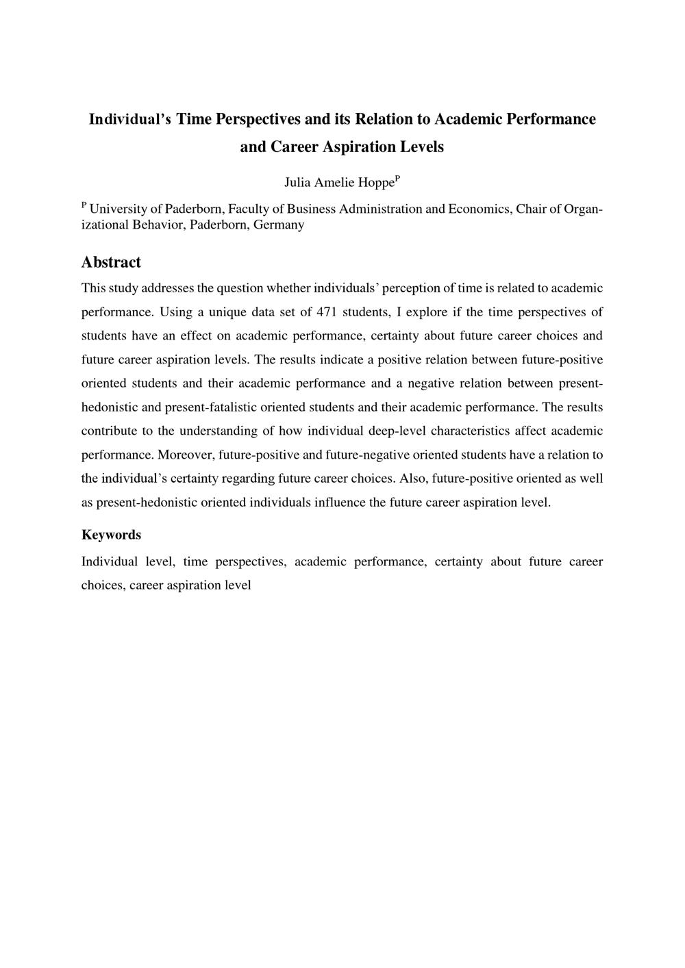 Individuals time perspectives and its relation to academic performance and career aspiration levels / Julia Amelie Hoppe