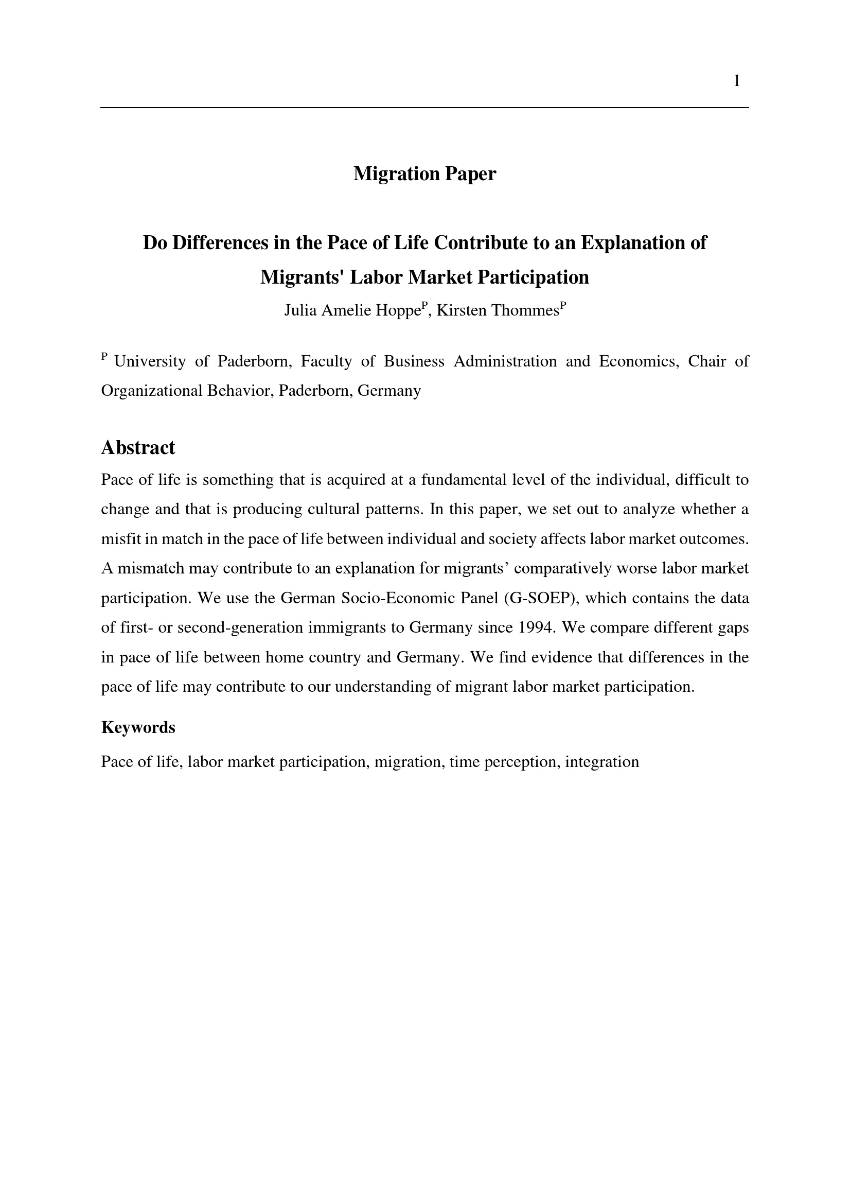 Do differences in the pace of life contribute to an explanation of migrants' labor market participation / Julia Amelie Hoppe, Kirsten Thommes