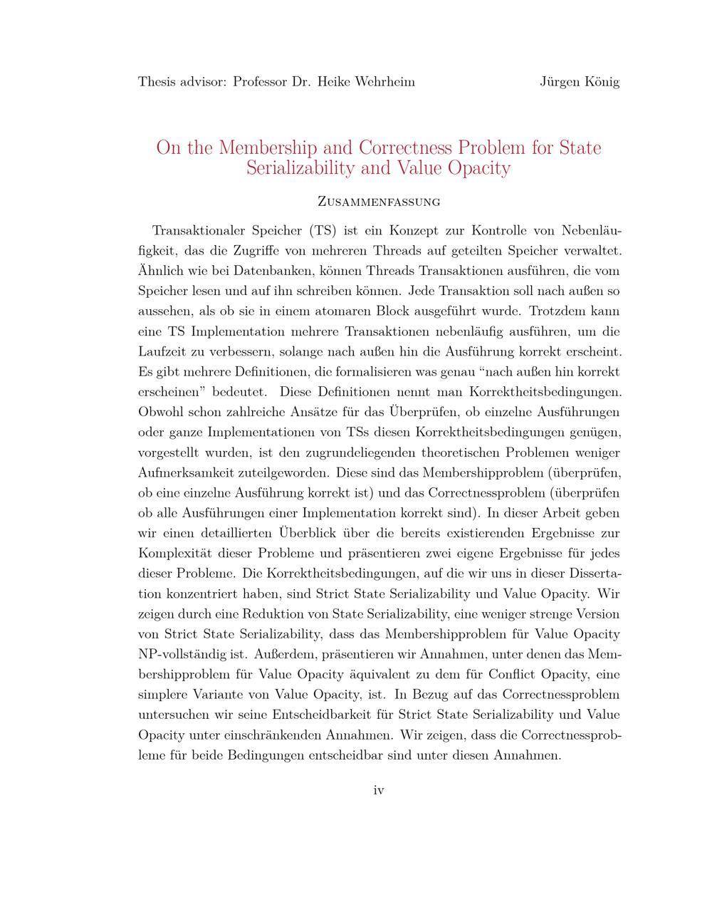 On the membership and correctness problem for state serializability and value opacity / vorgelegt von Jürgen König, M.Sc.