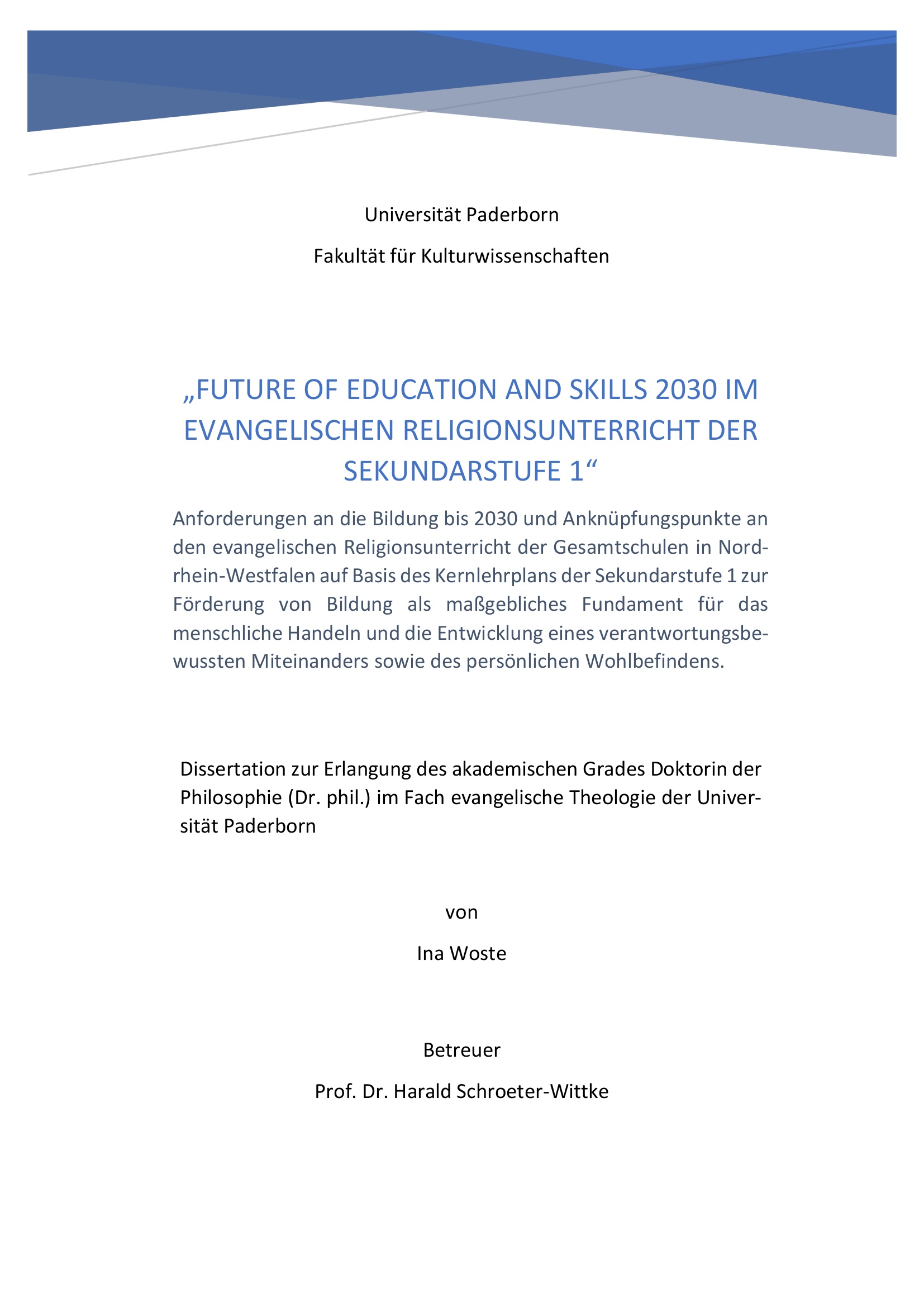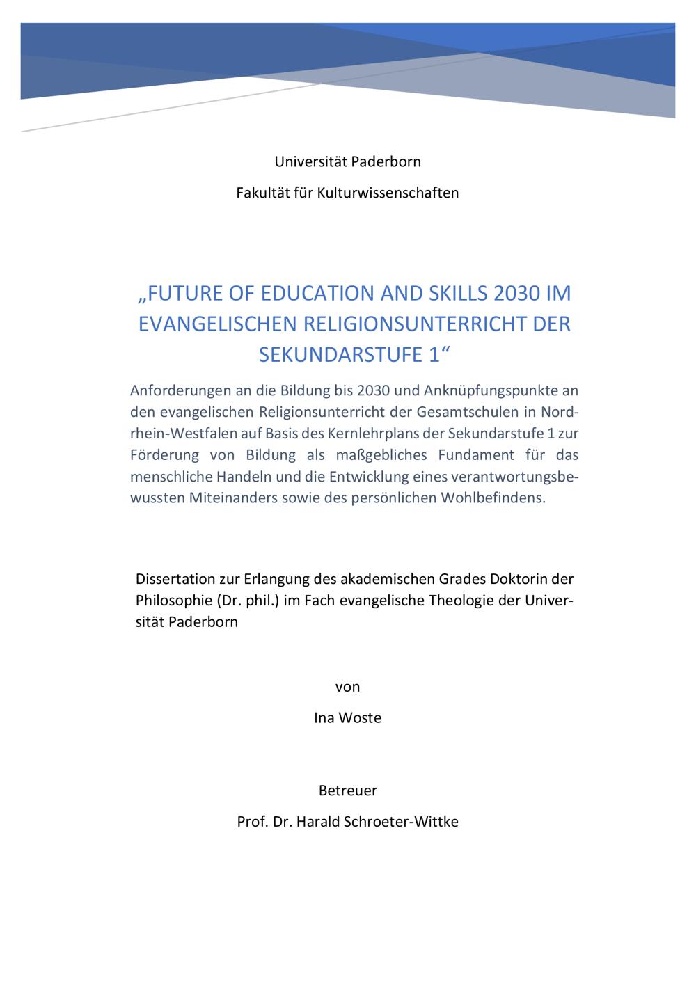 Future of education and skills 2030 im evangelischen Religionsunterricht der Sekundarstufe 1 : Anforderungen an die Bildung bis 2030 und Anknüpfungspunkte an den evangelischen Religionsunterricht der Gesamtschulen in Nordrhein-Westfalen auf Basis des Kernlehrplans der Sekundarstufe 1 zur Förderung von Bildung als maßgebliches Fundament für das menschliche Handeln und die Entwicklung eines verantwortungsbewussten Miteinanders sowie des persönlichen Wohlbefindens / von Ina Woste