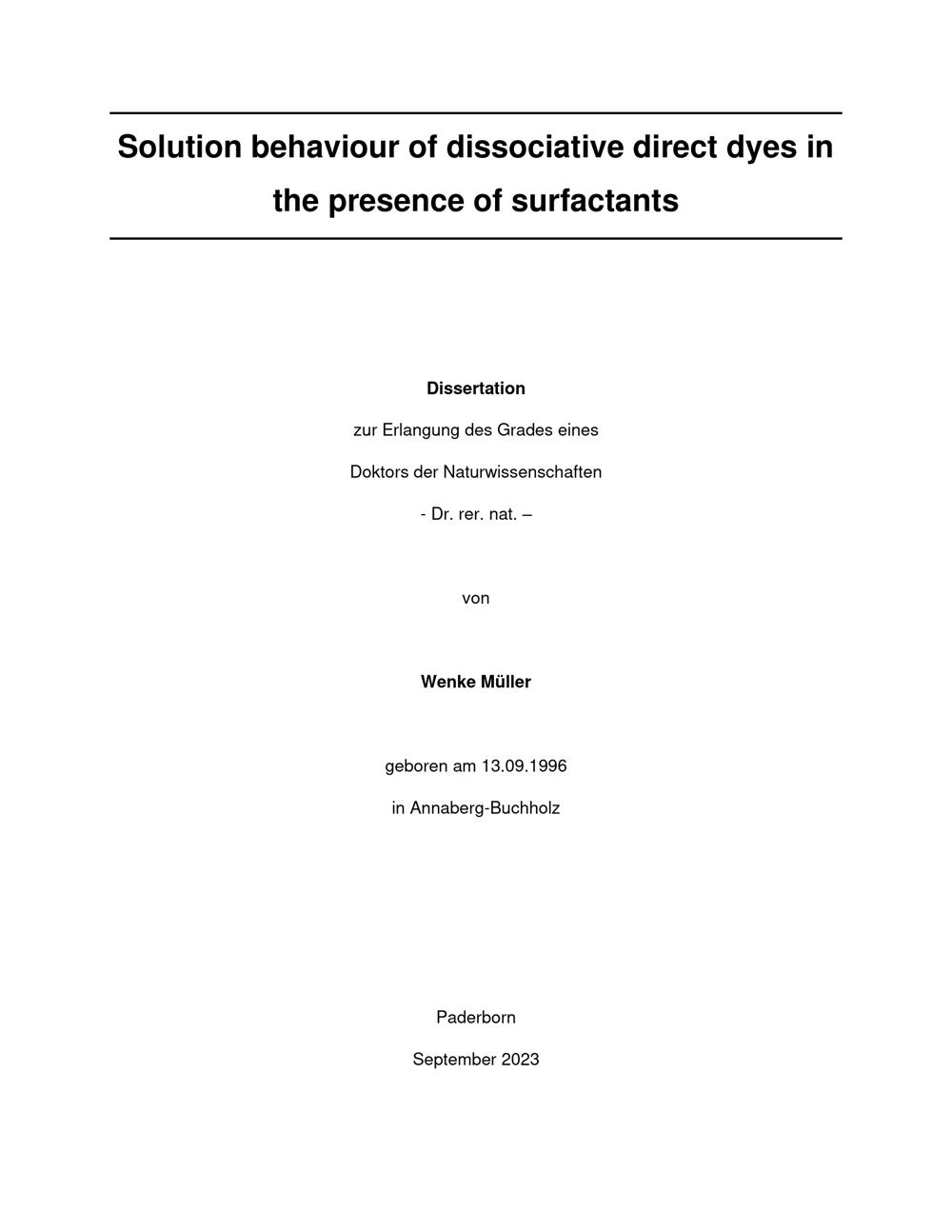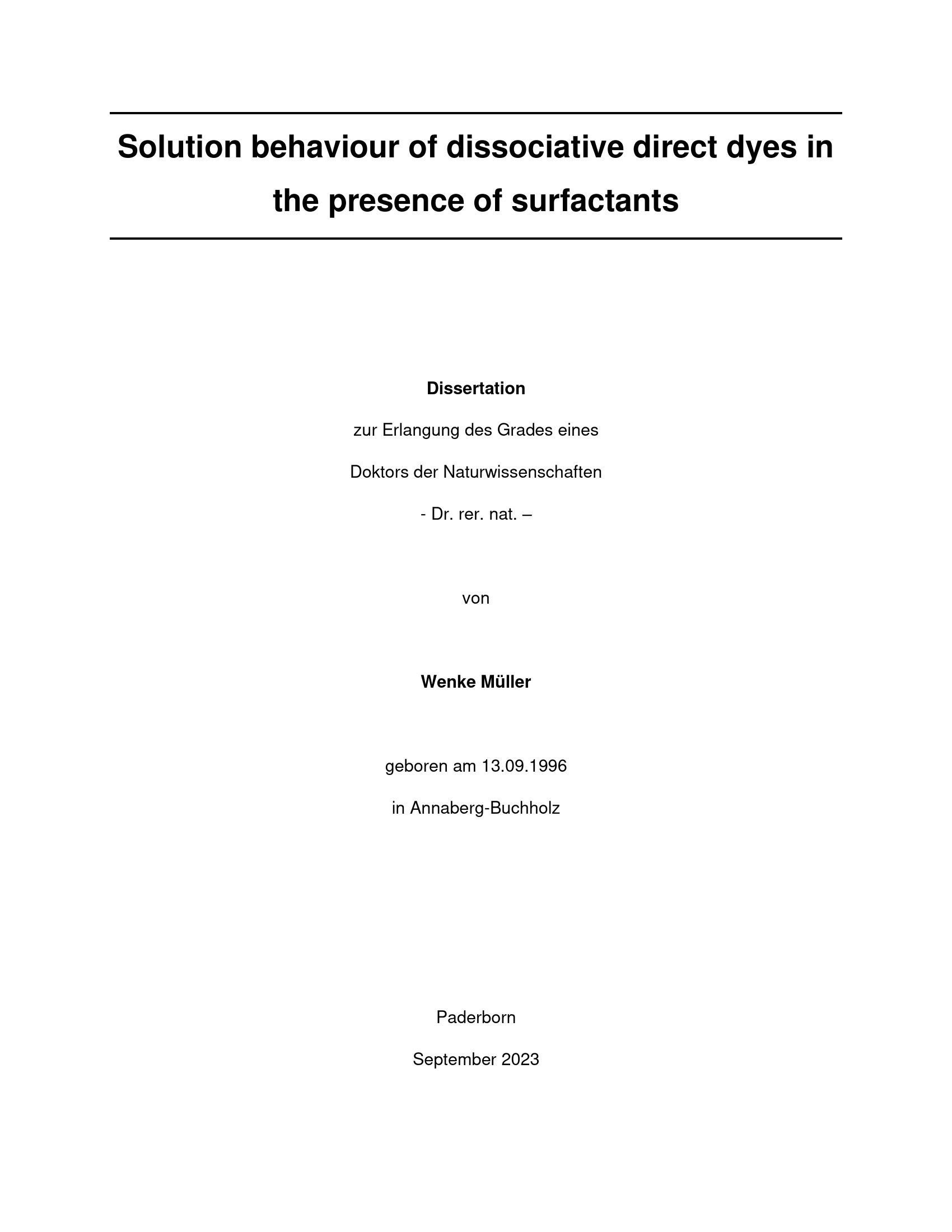 Solution behaviour of dissociative direct dyes in the presence of surfactants / Wenke Müller ; [Prüfungsausschuss: Prof. Dr. Klaus Huber Erstgutachter, Prof. Dr. Claudia Schmidt Zweitgutachter, Dr. Hans Egold, Prof. Dr. Sabine Fechner Vorsitz]