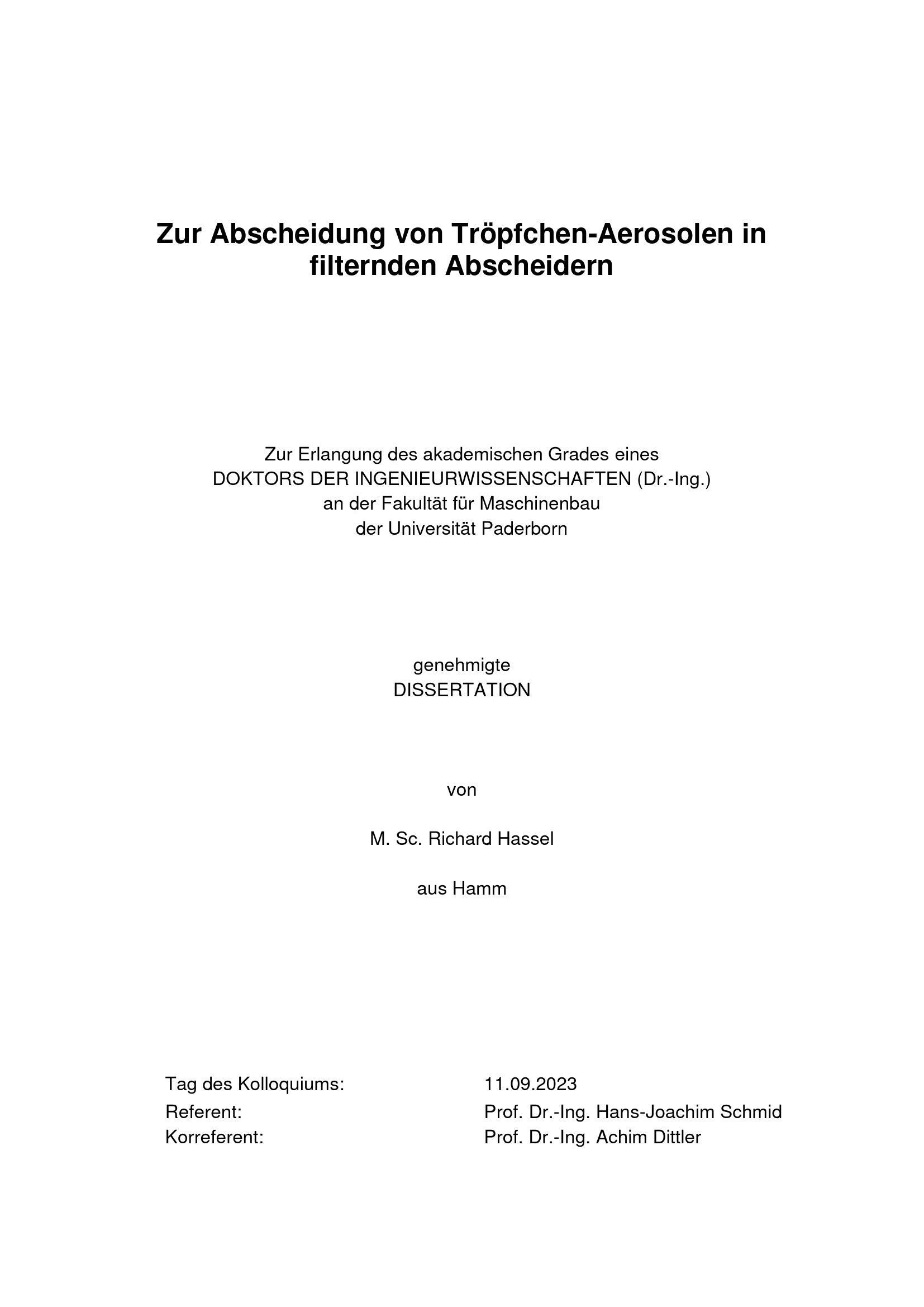 Zur Abscheidung von Tröpfchen-Aerosolen in filternden Abscheidern / von M. Sc. Richard Hassel ; Referent: Prof. Dr.-Ing. Hans-Joachim Schmid, Korreferent: Prof. Dr.-Ing. Achim Dittler