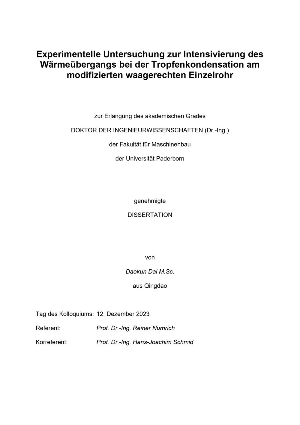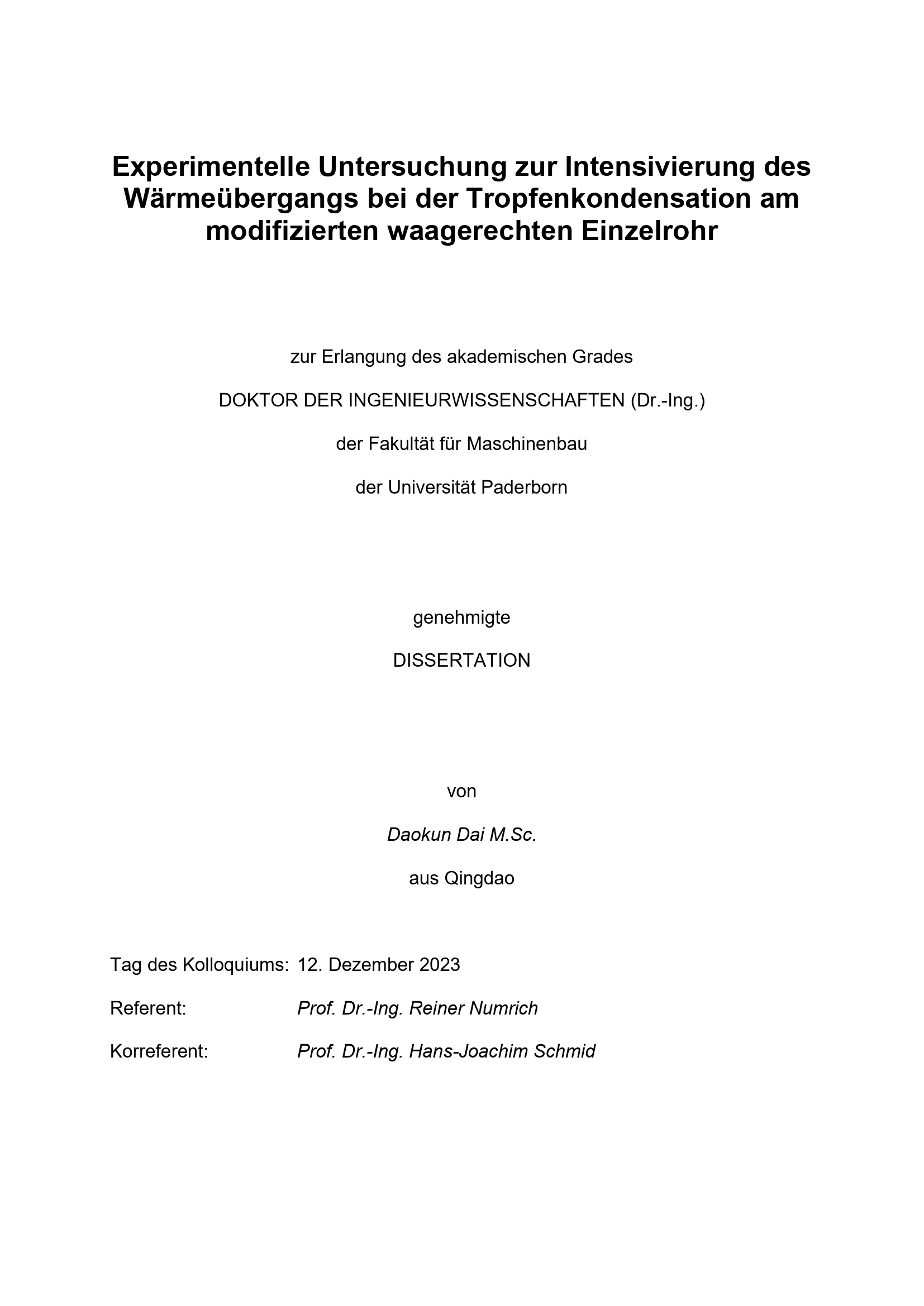 Experimentelle Untersuchung zur Intensivierung des Wärmeübergangs bei der Tropfenkondensation am modifizierten waagerechten Einzelrohr / von Daokun Dai M.Sc. ; Referent: Prof. Dr.-Ing. Reiner Numrich, Korreferent: Prof. Dr.-Ing. Hans-Joachim Schmid