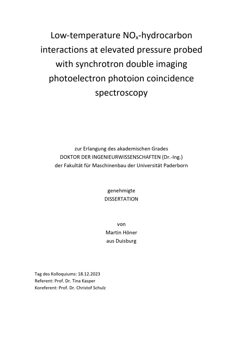 Low-temperature NOx-hydrocarbon interactions at elevated pressure probed with synchrotron double imaging photoelectron photoion coincidence spectroscopy / von Martin Höner ; Referent: Prof. Dr. Tina Kasper, Koreferent: Prof. Dr. Christof Schulz