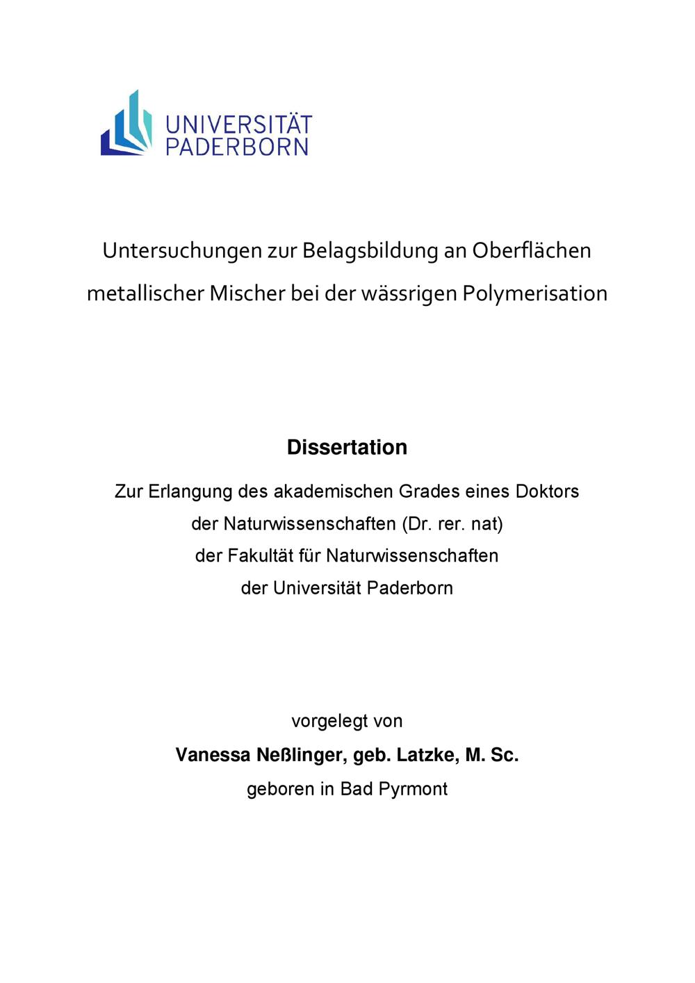 Untersuchungen zur Belagsbildung an Oberflächen metallischer Mischer bei der wässrigen Polymerisation / vorgelegt von Vanessa Neßlinger, geb. Latzke, M. Sc. ; Erstgutachter: Prof. Dr.-Ing. Guido Grundmeier, Zweitgutachter: Prof. Dr. Wolfgang Bremser