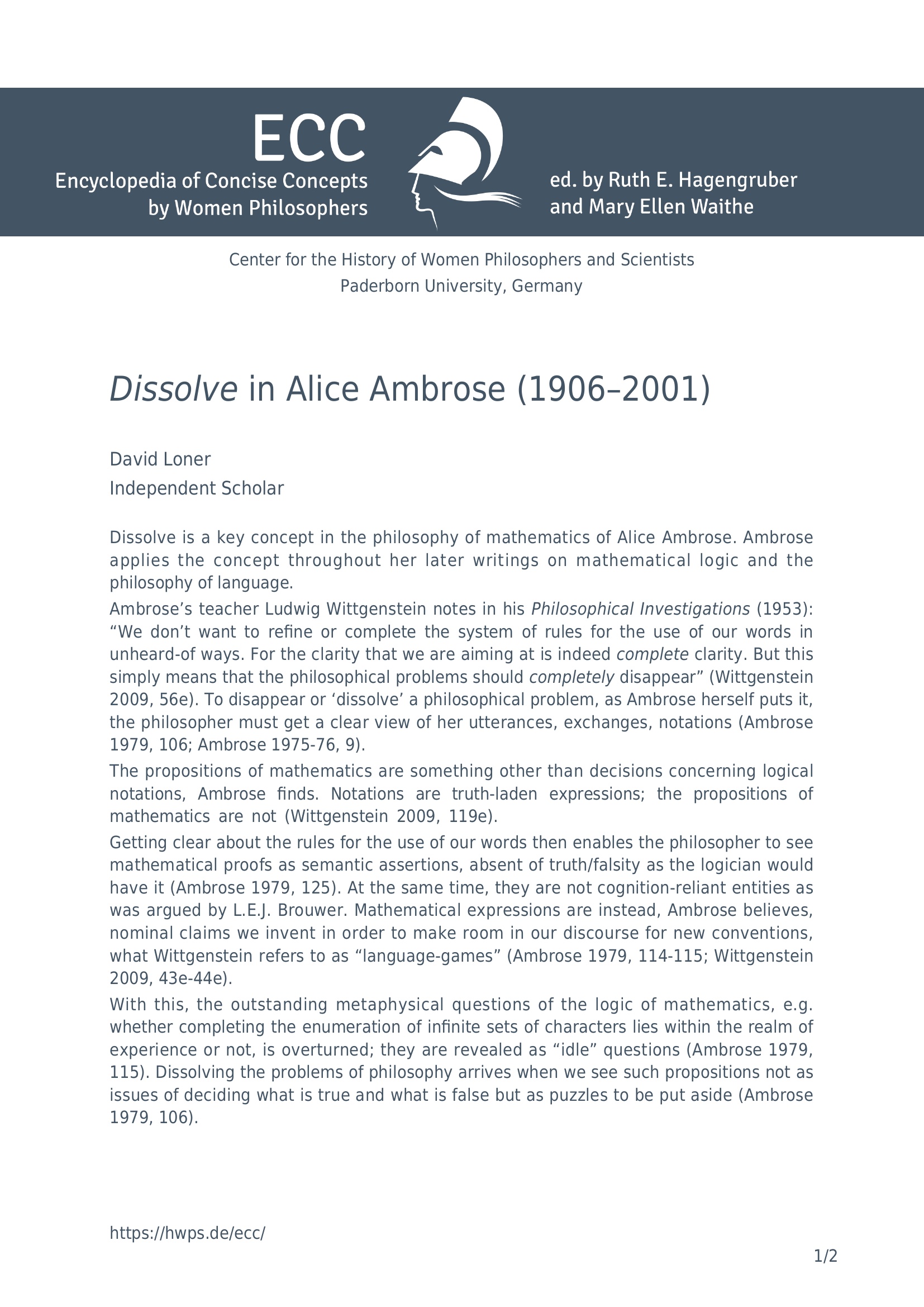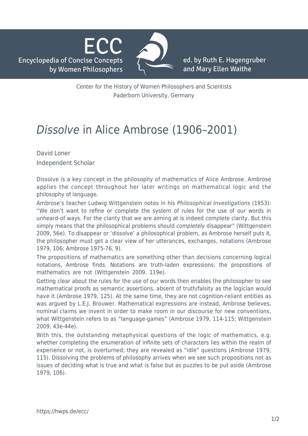 Dissolve in Alice Ambrose (1906-2001) / David Loner, Independent Scholar