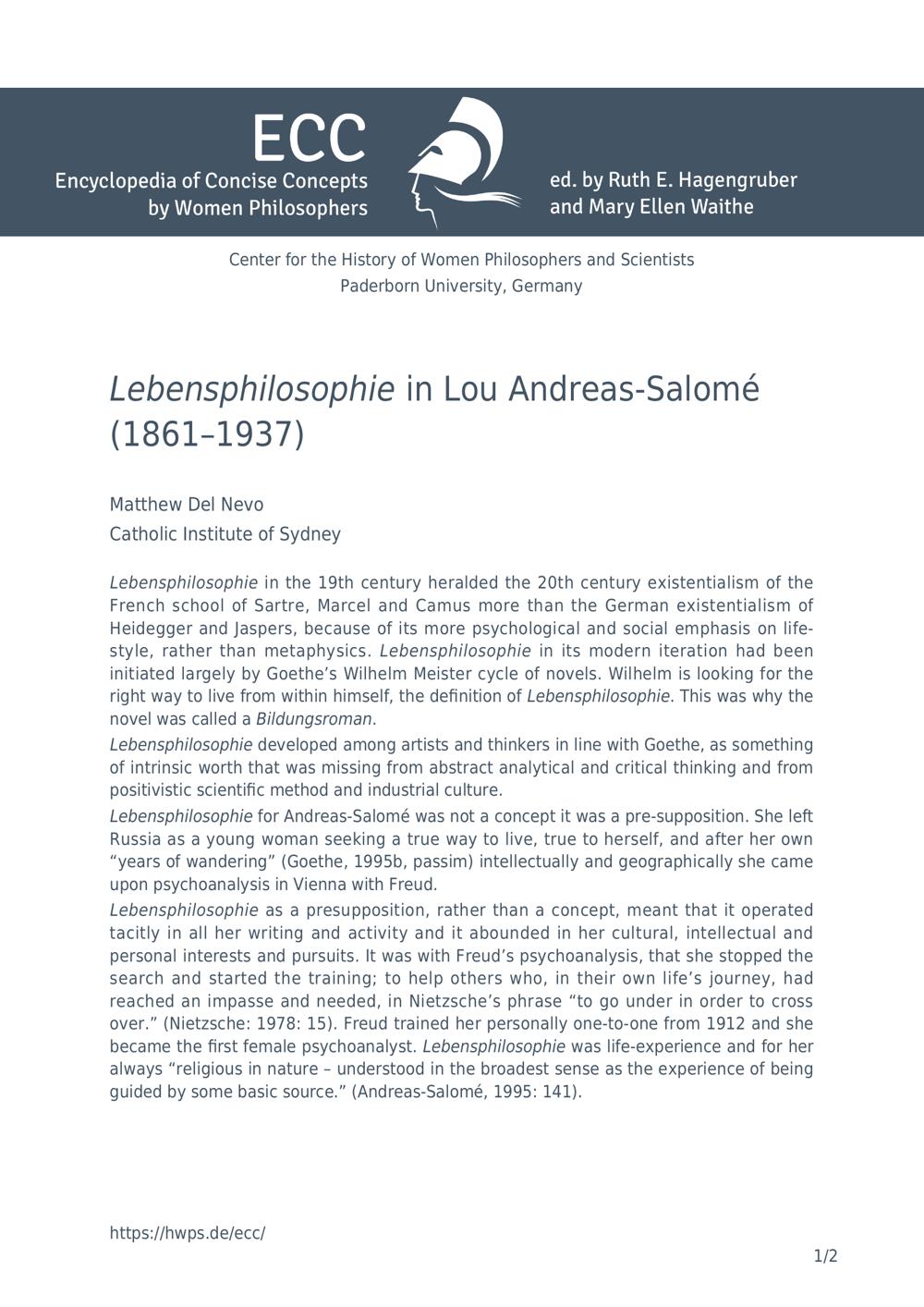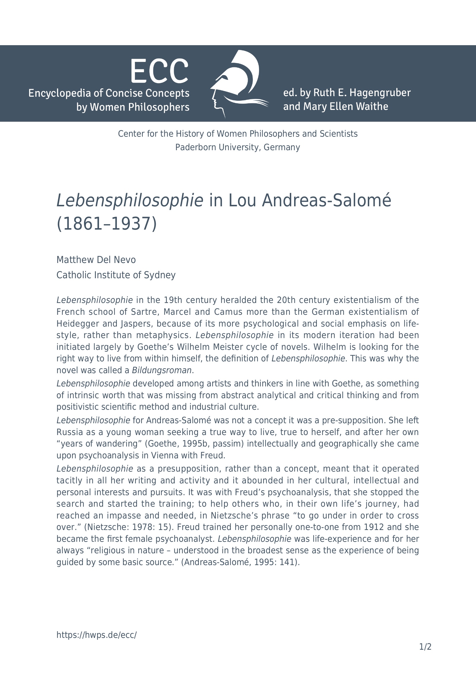 Lebensphilosophie in Lou Andreas-Salomé (1861-1937) / Matthew Del Nevo, Catholic Institute of Sydney