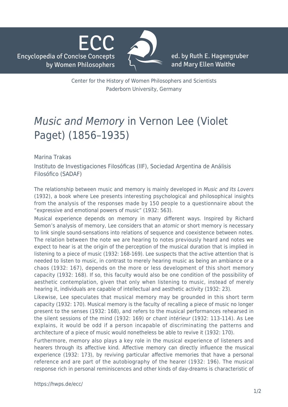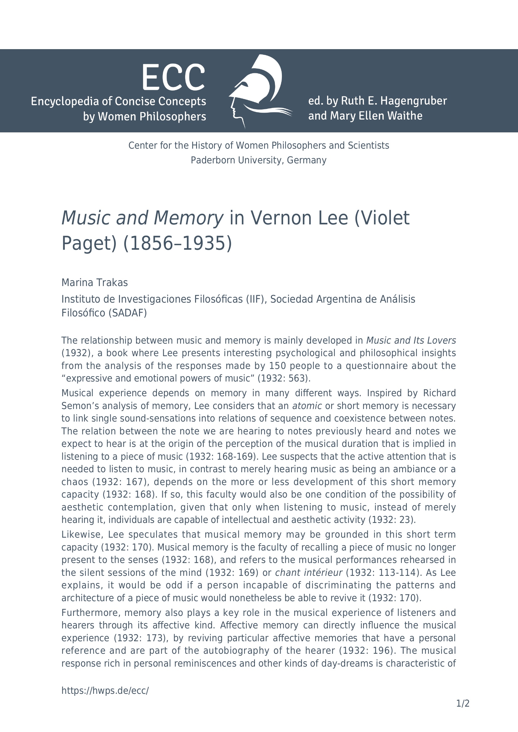 Music and memory in Vernon Lee (Violet Paget) (1856-1935) / Marina Trakas, Instituto de Investigaciones Filosóficas (IIF), Sociedad Argentina de Análisis Filosófico (SADAF)