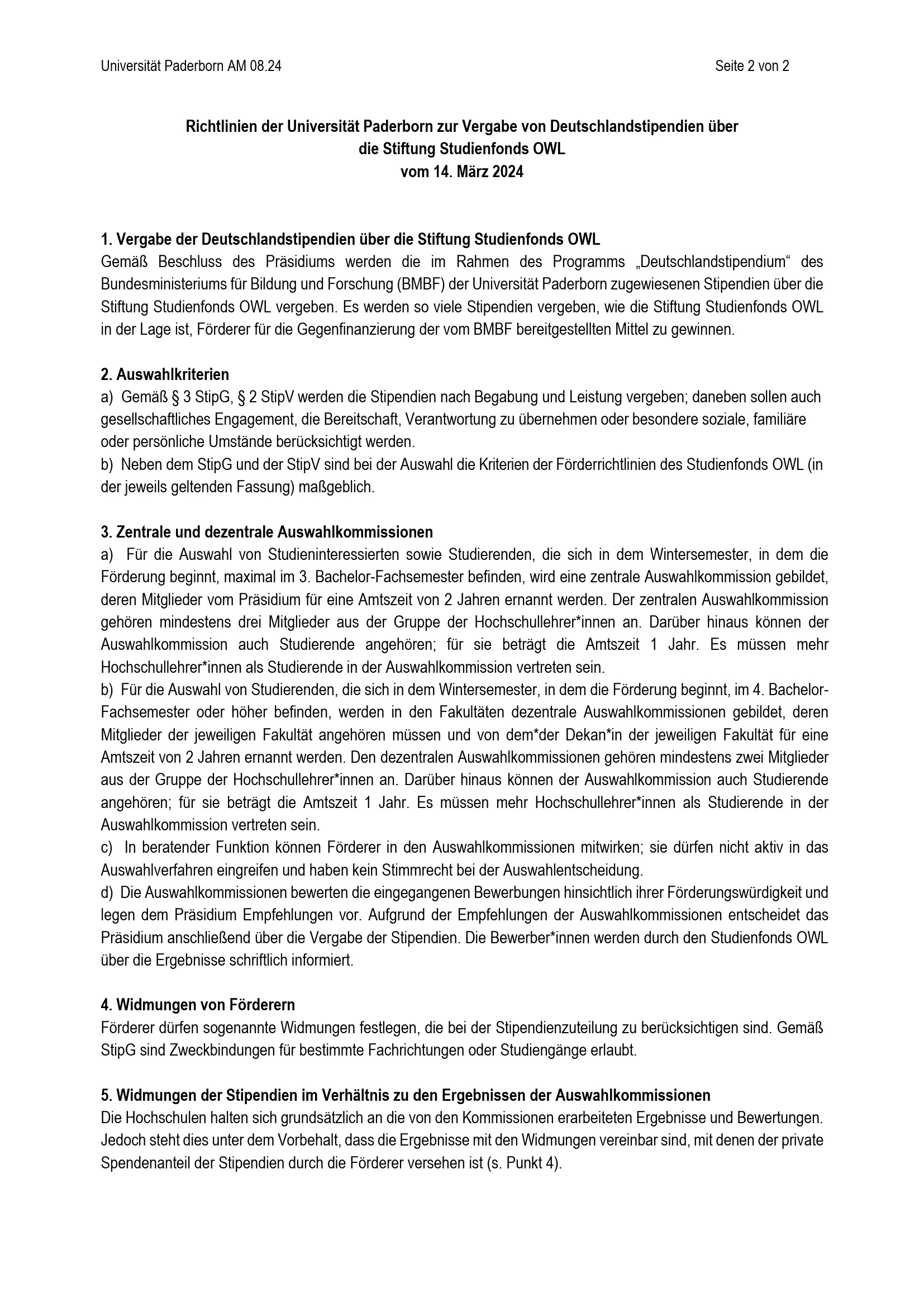Richtlinie der Universität Paderborn zur Vergabe der Deutschlandstipendien über die Stiftung Studienfonds OWL : vom 14. März 2024