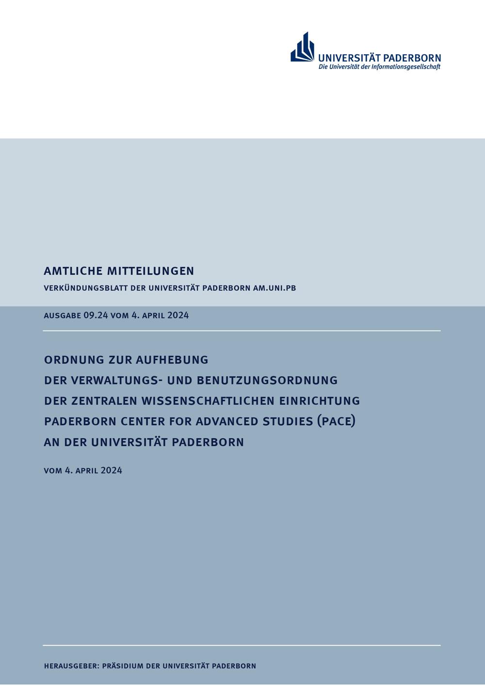 Ordnung zur Aufhebung der Verwaltungs- und Benutzungsordnung der zentralen wissenschaftlichen Einrichtung Paderborn Center for Advanced Studies (PACE) an der Universität Paderborn : vom 4. April 2024