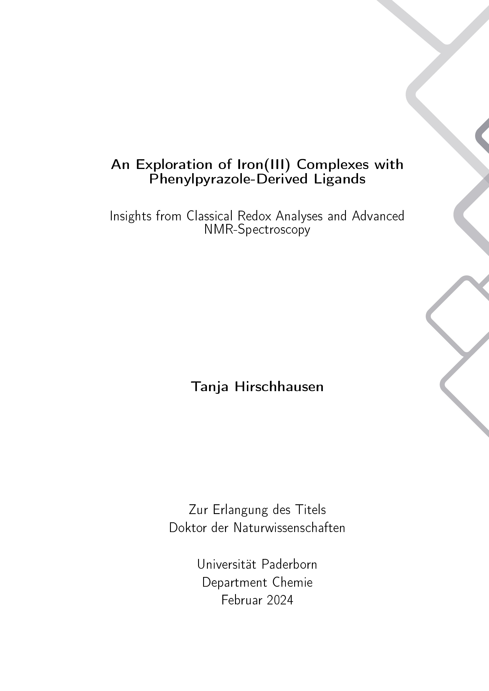 An exploration of Iron(III) complexes with phenylpyrazole-derived ligands : insights from classical redox analyses and advanced NMR-spectroscopy / Tanja Hirschhausen ; [Chairman: Prof. Dr. Jan Paradies, First Reviewer: Prof. Dr. Matthias Bauer, Second Reviewer: PD Dr. Hans Egold, Third Reviewer: Prof. Dr. Martin Brehm]