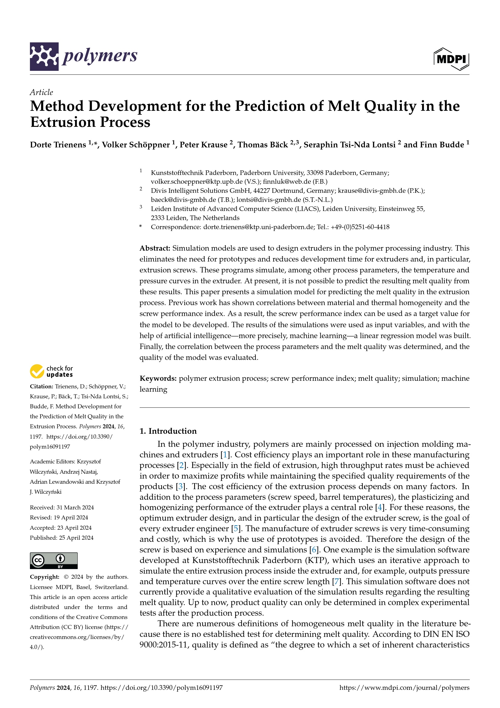 Method development for the prediction of melt quality in the extrusion process / Dorte Trienens, Volker Schöppner, Peter Krause, Thomas Bäck, Seraphin Tsi-Nda Lontsi and Finn Budde