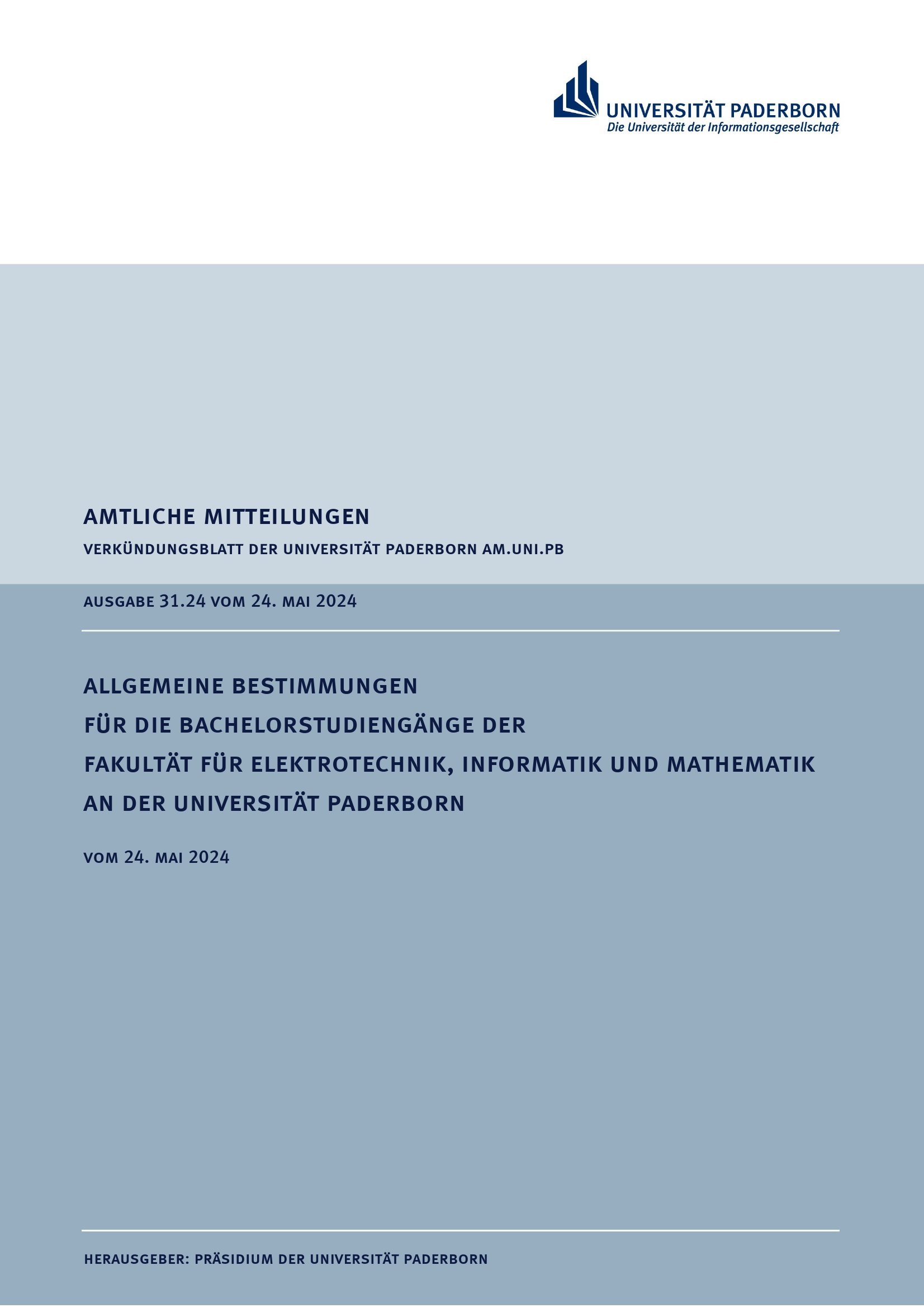 Allgemeine Bestimmungen für die Bachelorstudiengänge der Fakultät für Elektrotechnik, Informatik und Mathematik an der Universität Paderborn : vom 24. Mai 2024