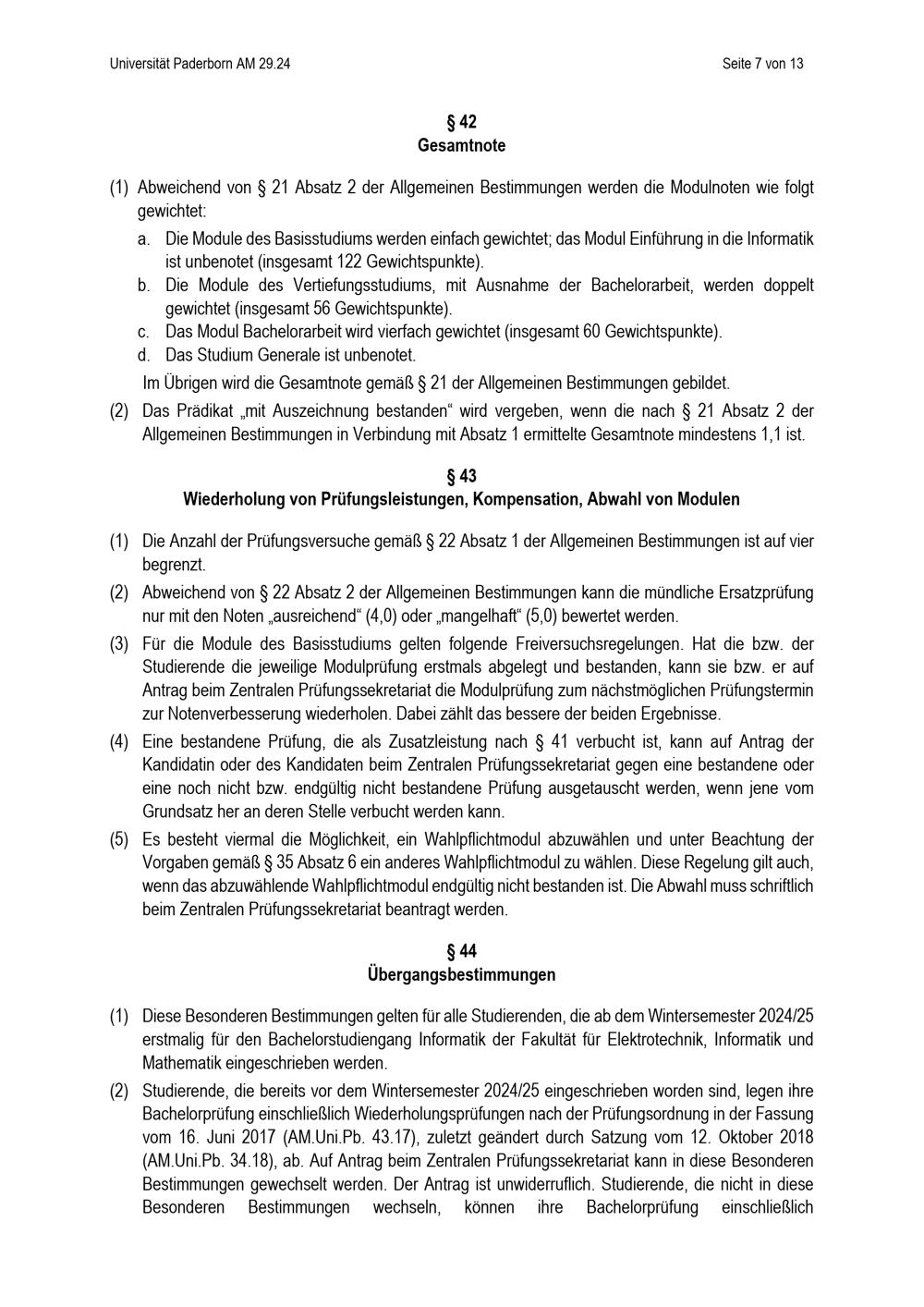 Besondere Bestimmungen der Prüfungsordnung für den Bachelorstudiengang Informatik der Fakultät für Elektrotechnik, Informatik und Mathematik an der Universität Paderborn : vom 24. Mai 2024