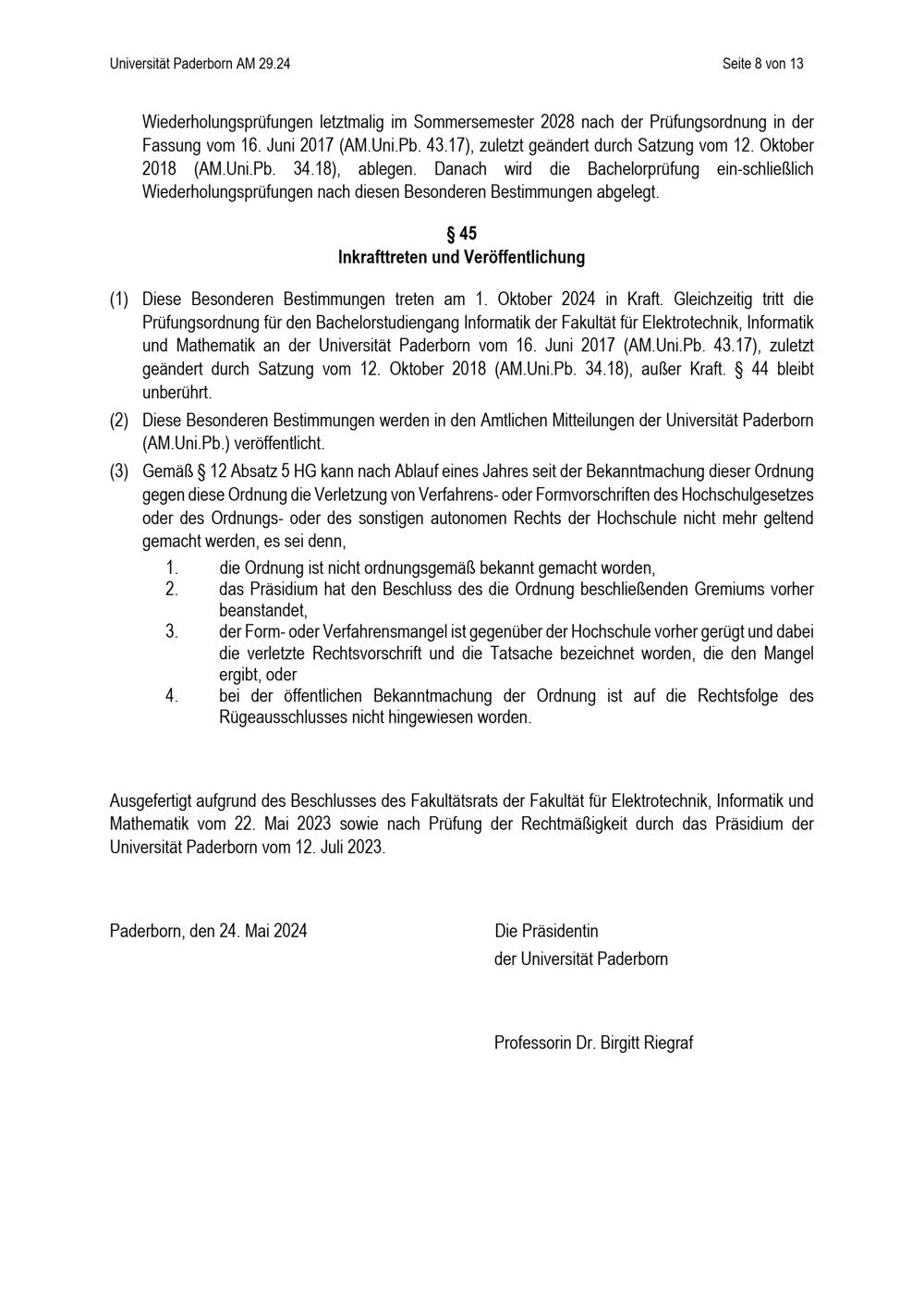 Besondere Bestimmungen der Prüfungsordnung für den Bachelorstudiengang Informatik der Fakultät für Elektrotechnik, Informatik und Mathematik an der Universität Paderborn : vom 24. Mai 2024