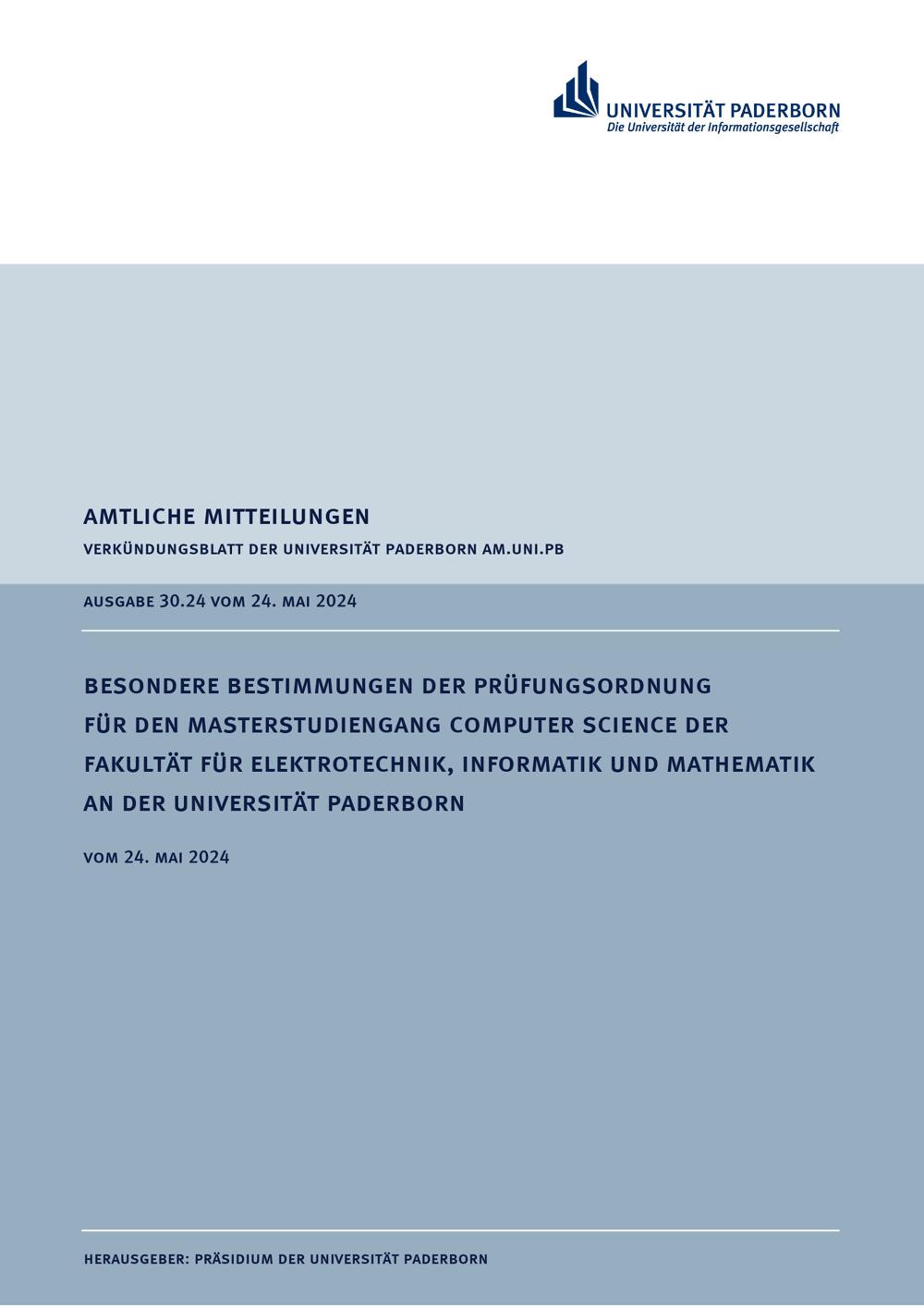 Besondere Bestimmungen der Prüfungsordnung für den Masterstudiengang Computer Science der Fakultät für Elektrotechnik, Informatik und Mathematik an der Universität Paderborn : vom 24. Mai 2024