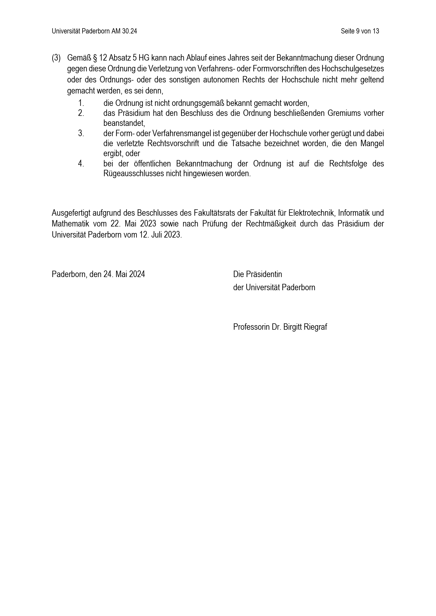 Besondere Bestimmungen der Prüfungsordnung für den Masterstudiengang Computer Science der Fakultät für Elektrotechnik, Informatik und Mathematik an der Universität Paderborn : vom 24. Mai 2024