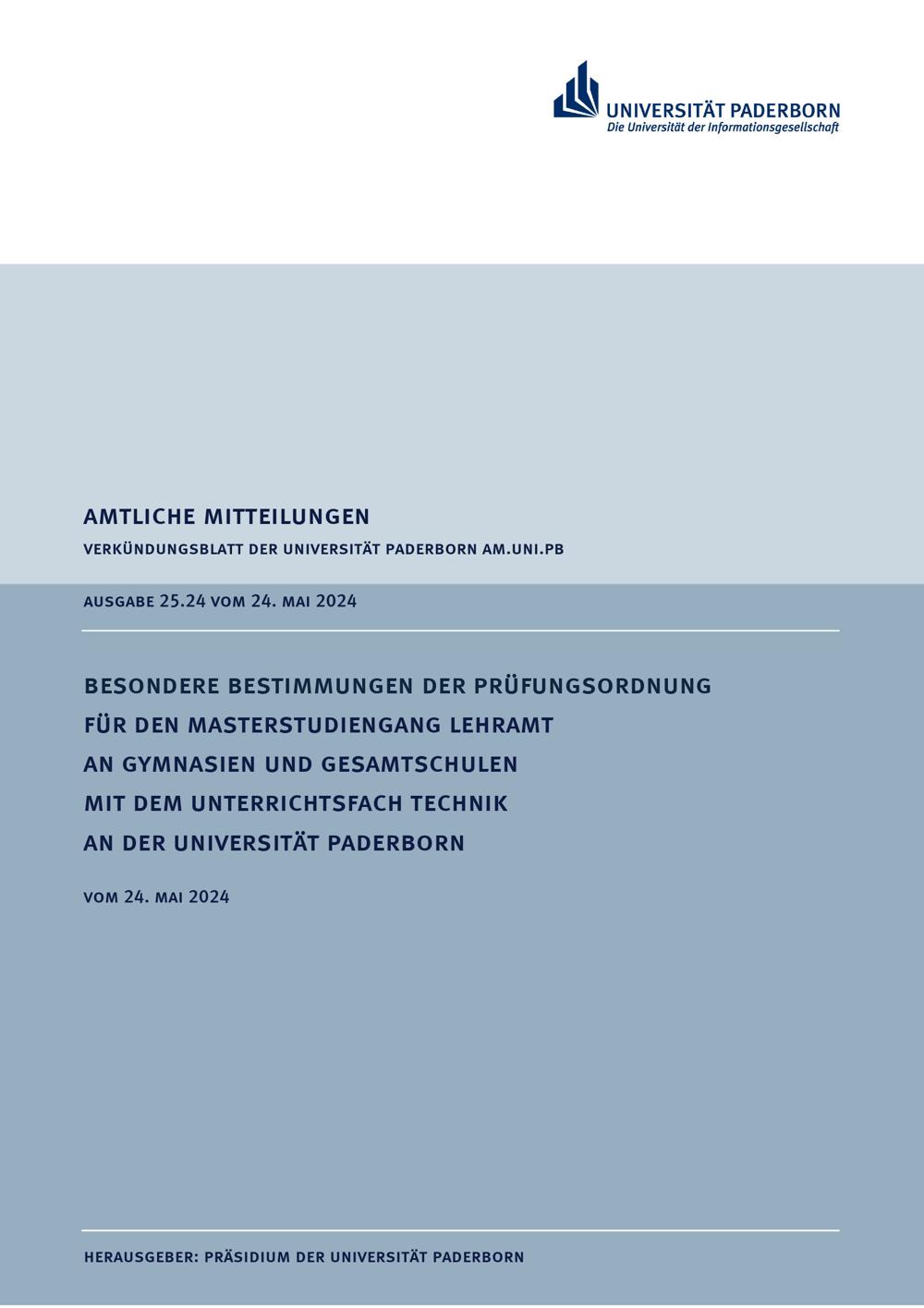 Besondere Bestimmungen der Prüfungsordnung für den Masterstudiengang Lehramt an Gymnasien und Gesamtschulen mit dem Unterrichtsfach Technik an der Universität Paderborn : vom 24. Mai 2024