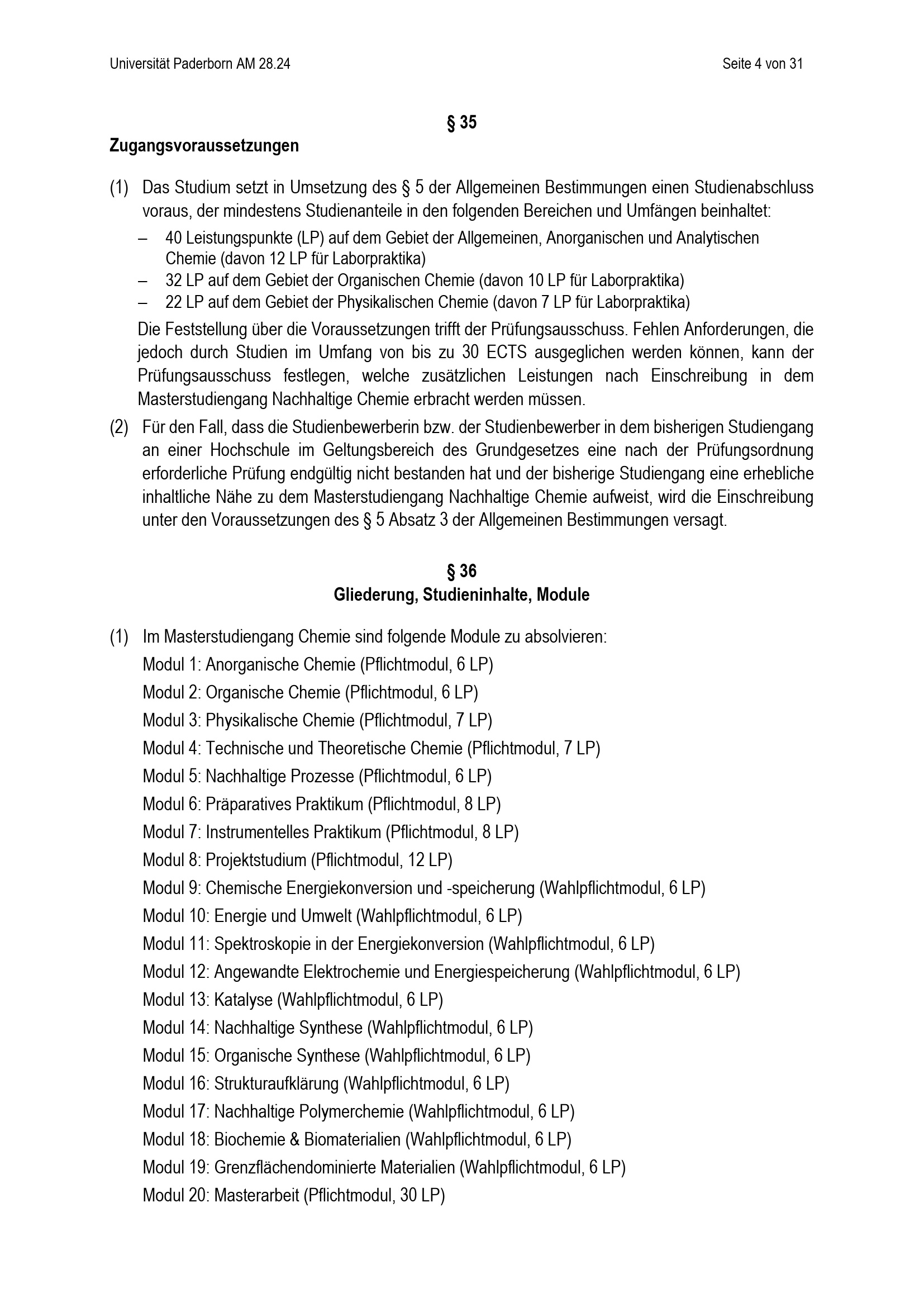 Besondere Bestimmungen der Prüfungsordnung für den Masterstudiengang Nachhaltige Chemie der Fakultät für Naturwissenschaften an der Universität Paderborn : vom 24. Mai 2024