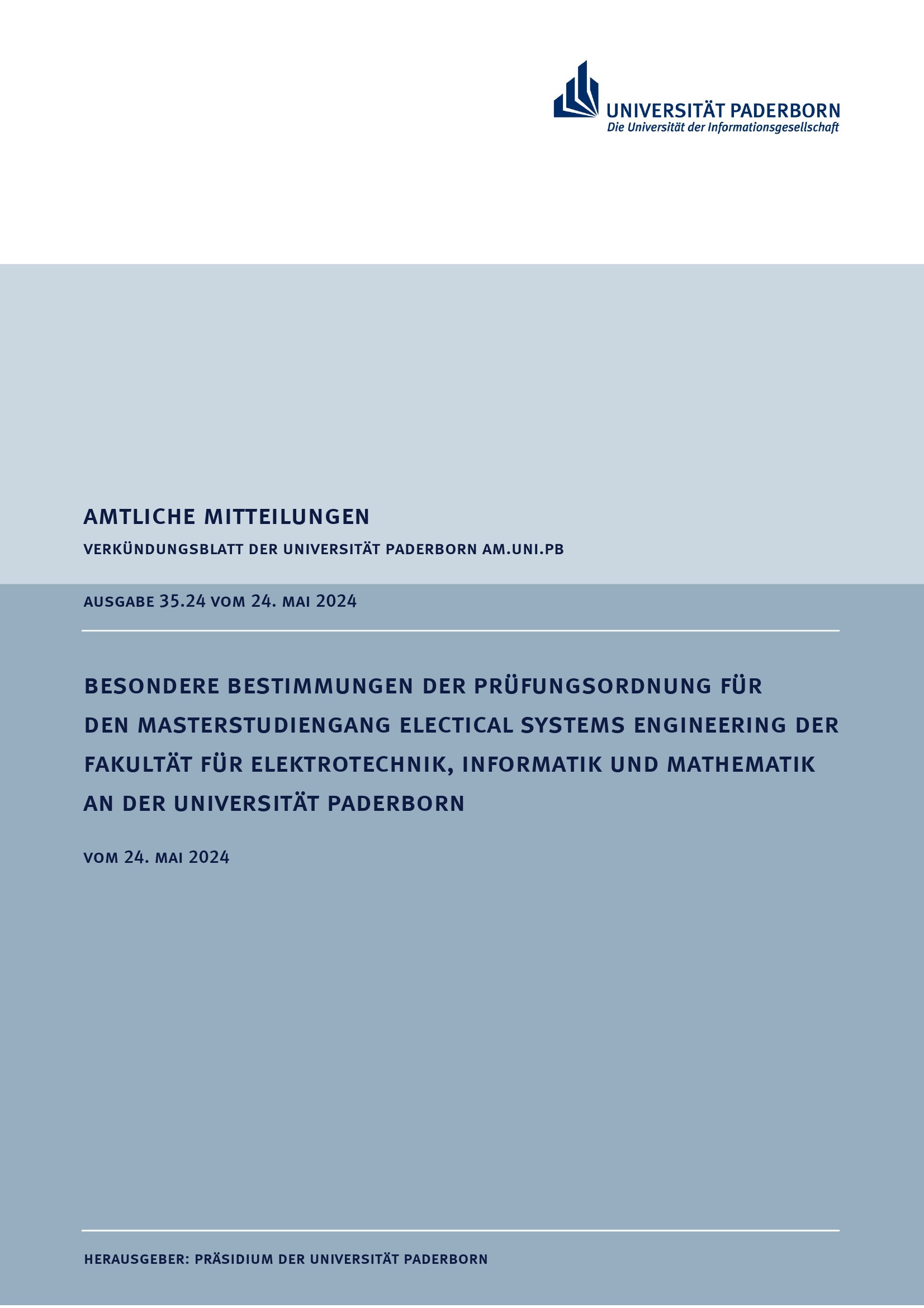 Besondere Bestimmungen der Prüfungsordnung für den Masterstudiengang Electrical Systems Engineering der Fakultät für Elektrotechnik, Informatik und Mathematik an der Universität Paderborn : vom 24. Mai 2024