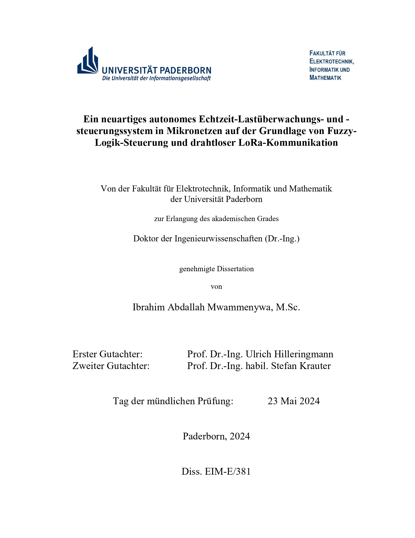 A novel autonomous and real-time load monitoring and control system in microgrids based on fuzzy logic control and LoRa wireless communication / Ibrahim A. Mwammenywa ; [First reviewer: Prof. Dr.-Ing. Ulrich Hilleringmann, Second reviewer: Prof. Dr.-Ing. habil. Stefan Krauter]