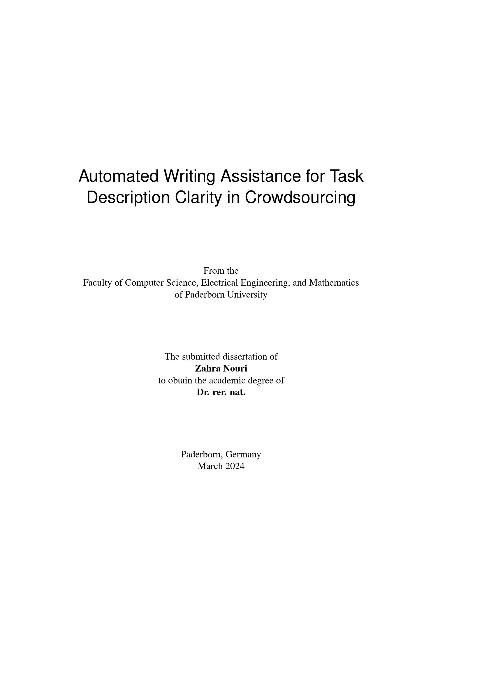 Automated writing assistance for task description clarity in crowdsourcing / Zahra Nouri ; [Reviewers: Prof. Dr. Henning Wachsmuth, Leibniz University Hannover, Prof. Dr. Ir. Ujwal Gadiraju, Delft University of Technology]