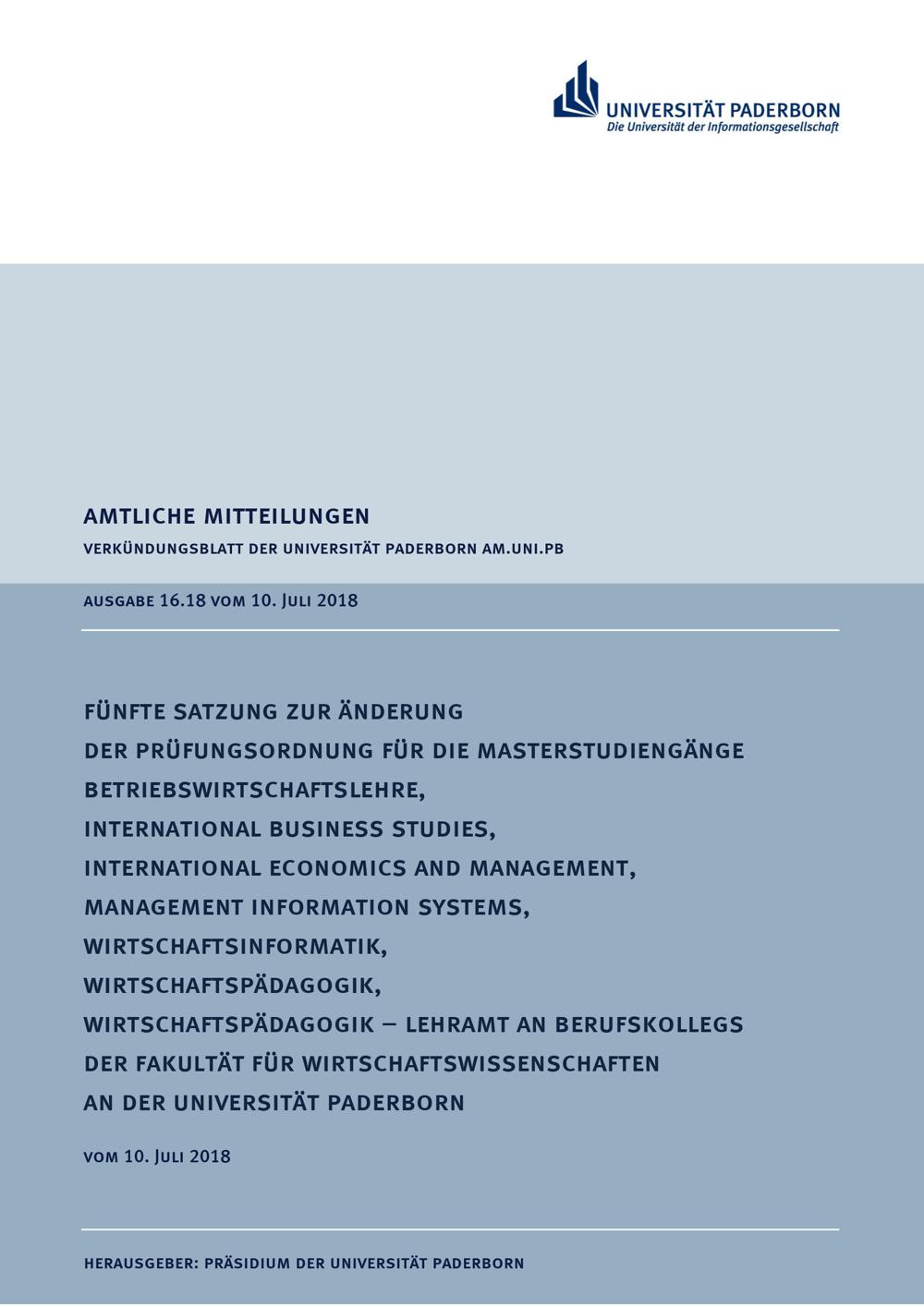 Fünfte Satzung zur Änderung der Prüfungsordnung für die Masterstudiengänge Betriebswirtschaftslehre, International Business Studies, International Economics and Management, Management Information Systems, Wirtschaftsinformatik, Wirtschaftspädagogik : Wirtschaftspädagogik - Lehramt an Berufskollegs der Fakultät für Wirtschaftswissenschaften an der Universität Paderborn : vom 10. Juli 2018