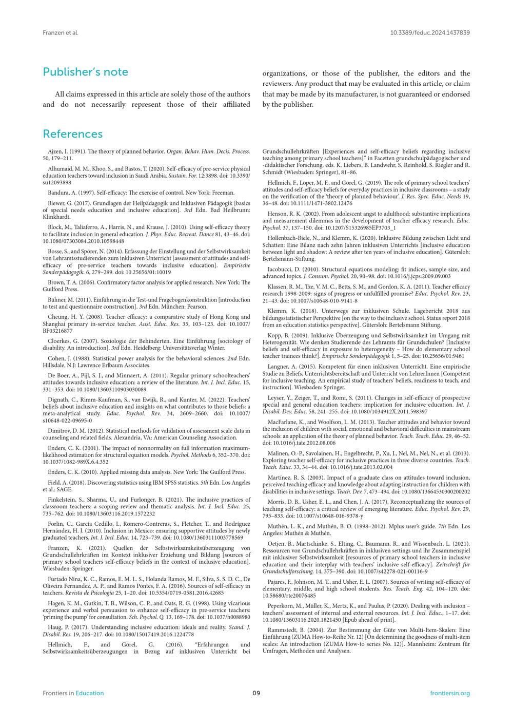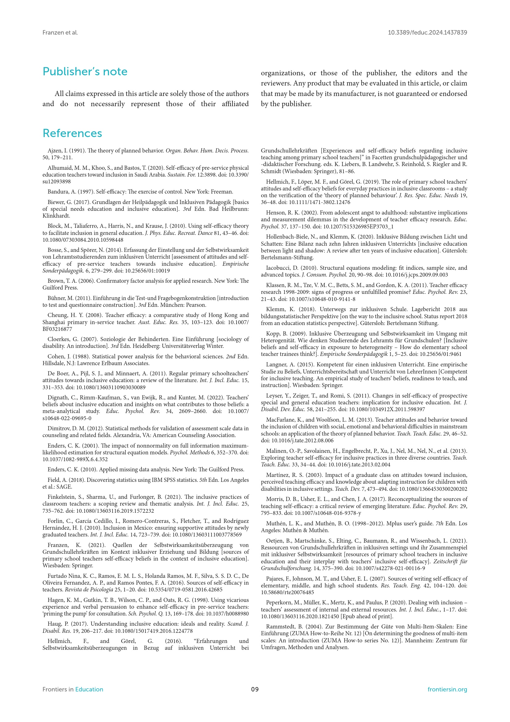 Predictors of primary school teachers self-efficacy beliefs for inclusive education / Katja Franzen, Barbara Moschner and Frank Hellmich