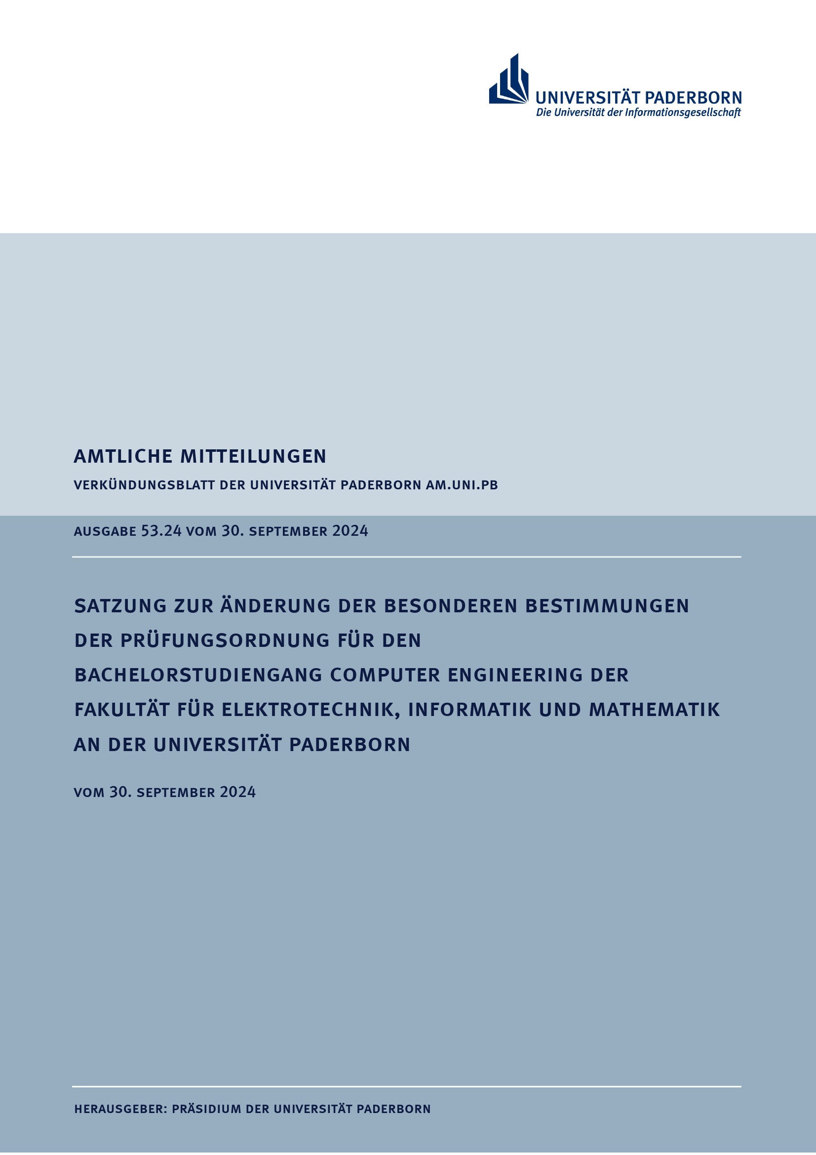 Satzung zur Änderung der Besonderen Bestimmungen der Prüfungsordnung für den Bachelorstudiengang Computer Engineering der Fakultät für Elektrotechnik, Informatik und Mathematik an der Universität Paderborn : vom 30. September 2024