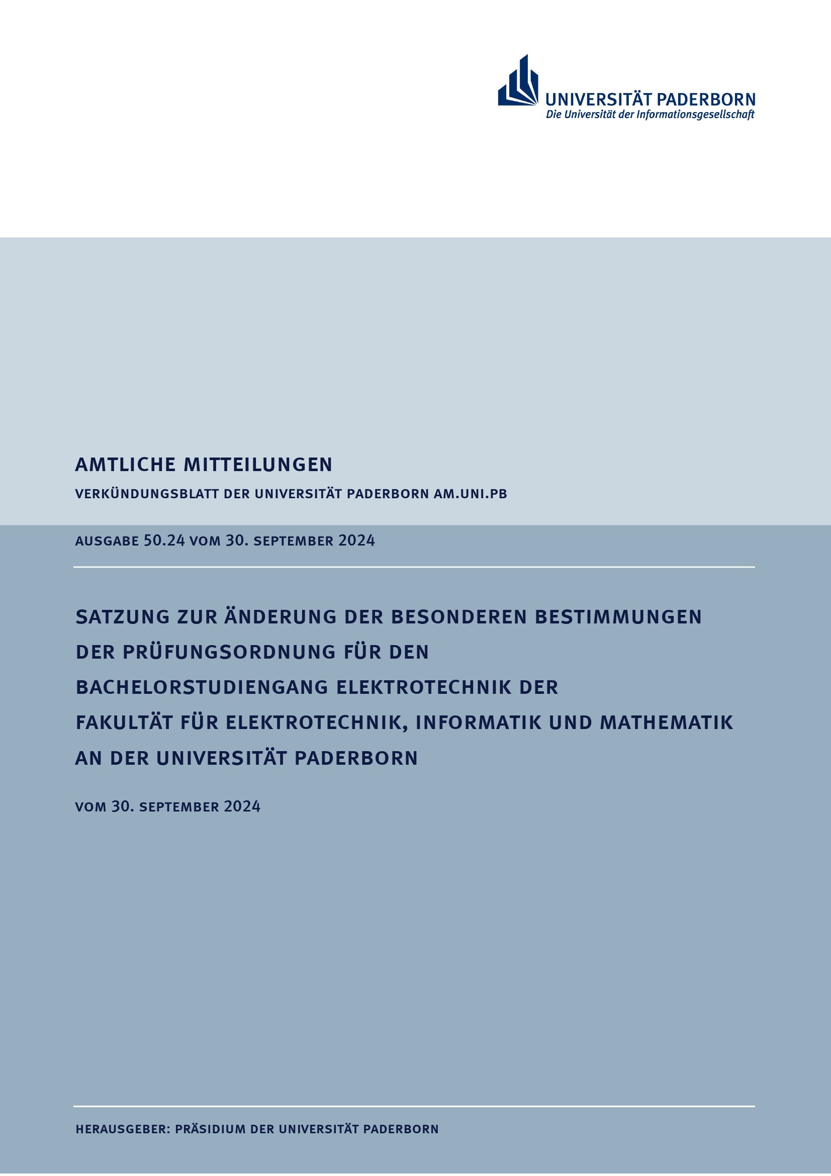 Satzung zur Änderung der Besonderen Bestimmungen der Prüfungsordnung für den Bachelorstudiengang Elektrotechnik der Fakultät für Elektrotechnik, Informatik und Mathematik an der Universität Paderborn : vom 30. September 2024