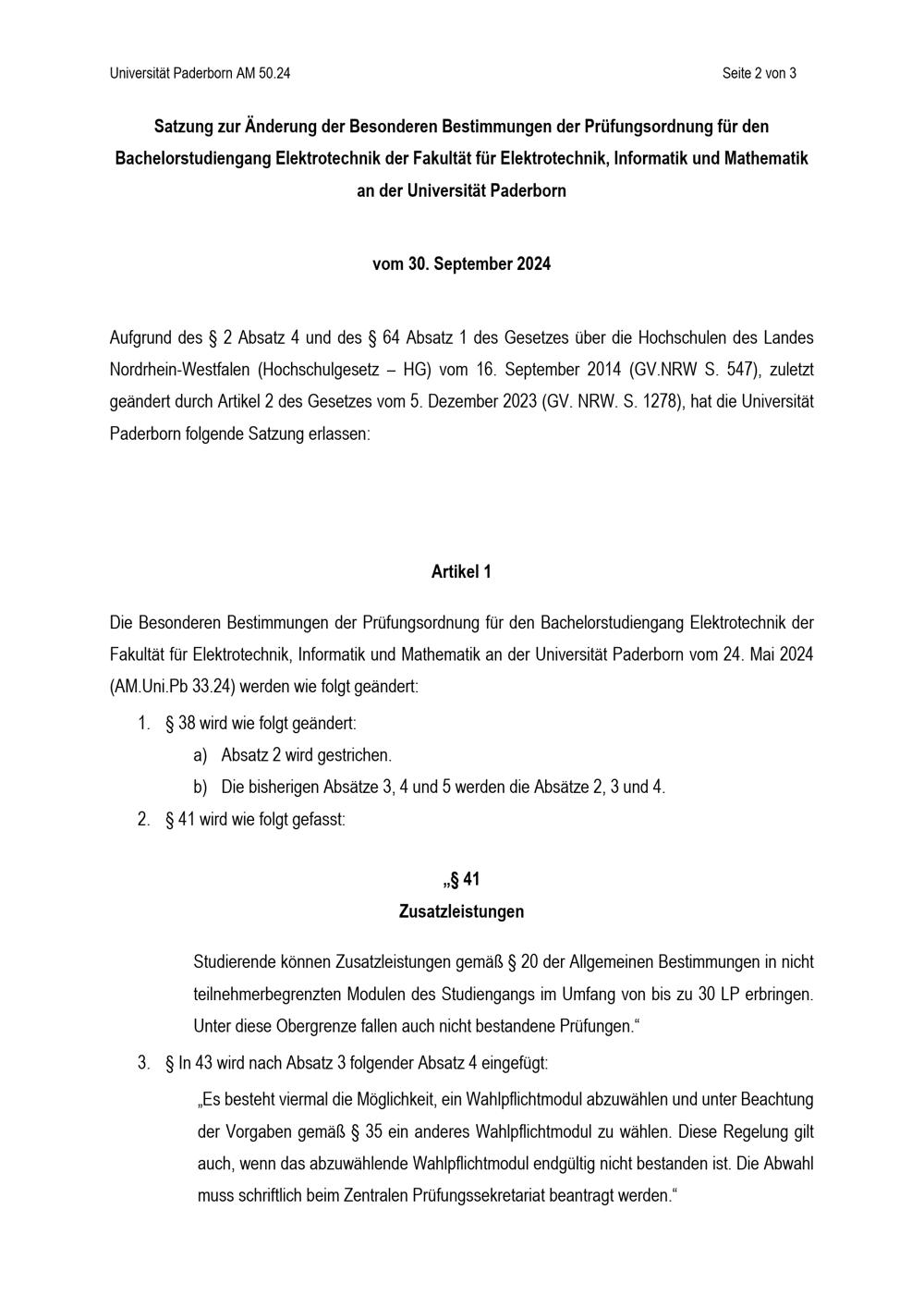 Satzung zur Änderung der Besonderen Bestimmungen der Prüfungsordnung für den Bachelorstudiengang Elektrotechnik der Fakultät für Elektrotechnik, Informatik und Mathematik an der Universität Paderborn : vom 30. September 2024