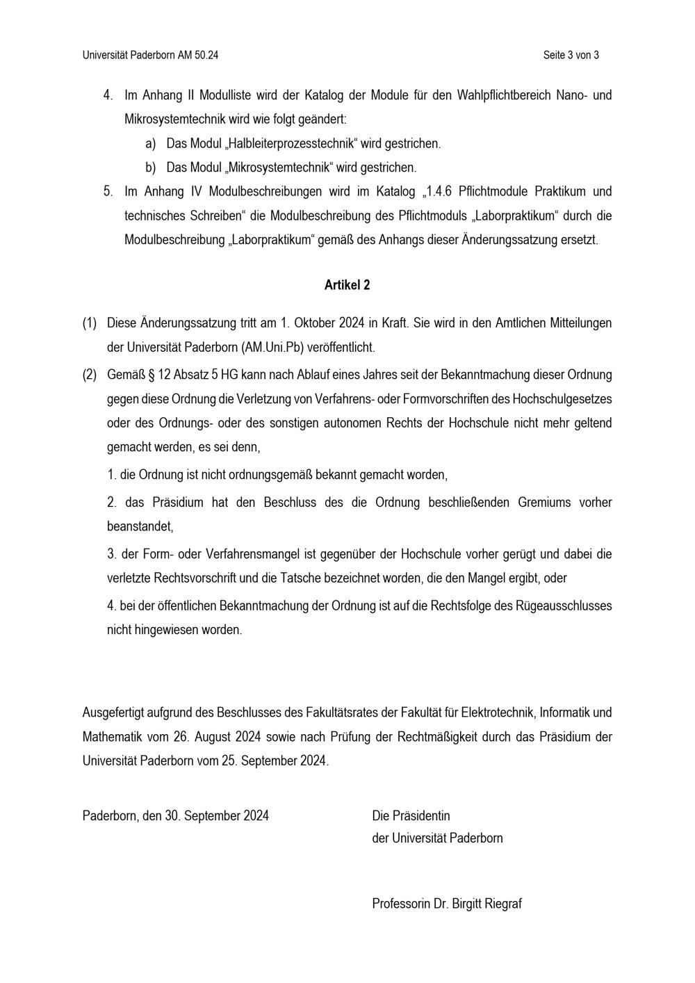 Satzung zur Änderung der Besonderen Bestimmungen der Prüfungsordnung für den Bachelorstudiengang Elektrotechnik der Fakultät für Elektrotechnik, Informatik und Mathematik an der Universität Paderborn : vom 30. September 2024