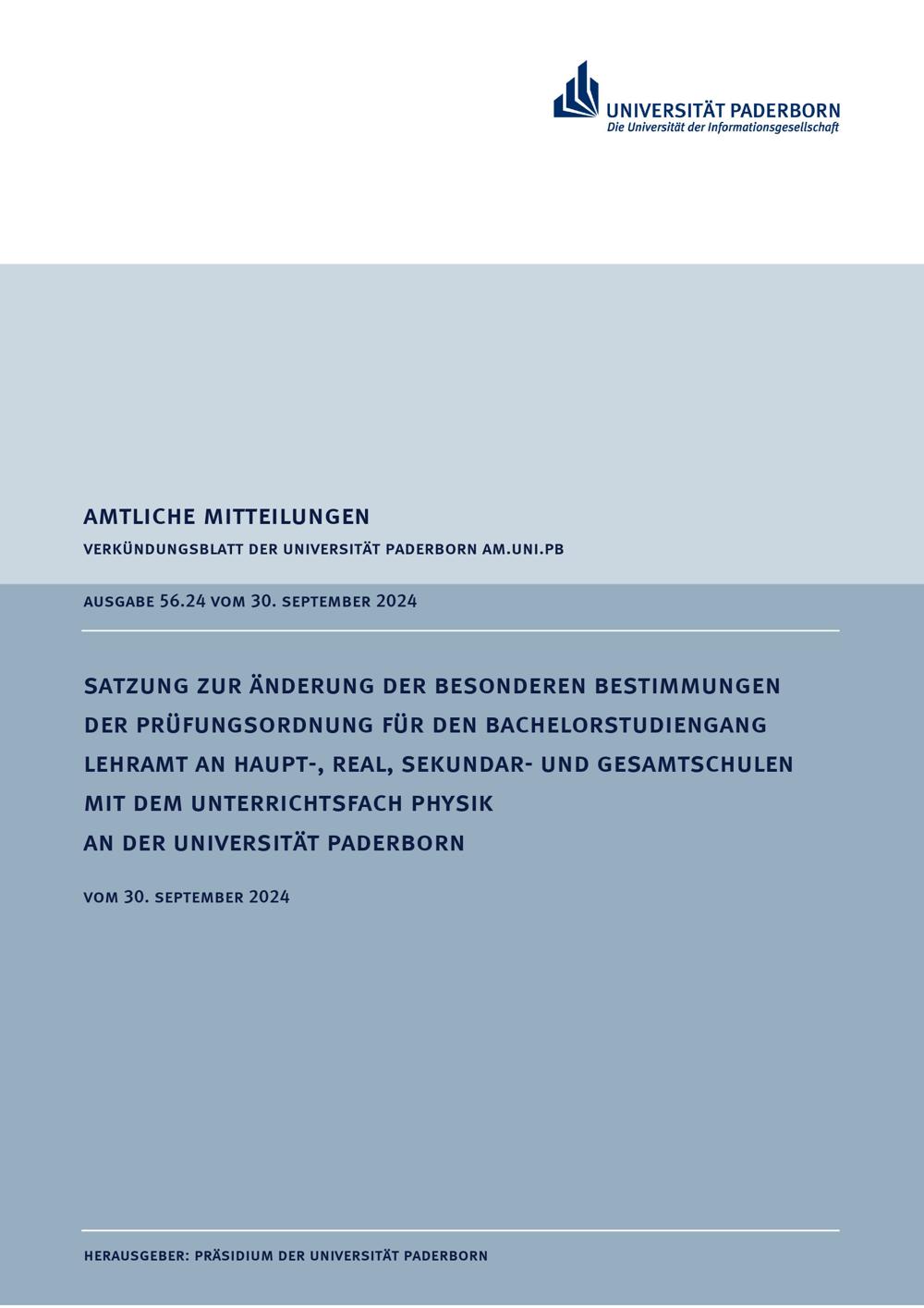 Satzung zur Änderung der Besonderen Bestimmungen der Prüfungsordnung für den Bachelorstudiengang Lehramt an Haupt-, Real-, Sekundar- und Gesamtschulen mit dem Unterrichtsfach Physik an der Universität Paderborn : vom 30. September 2024