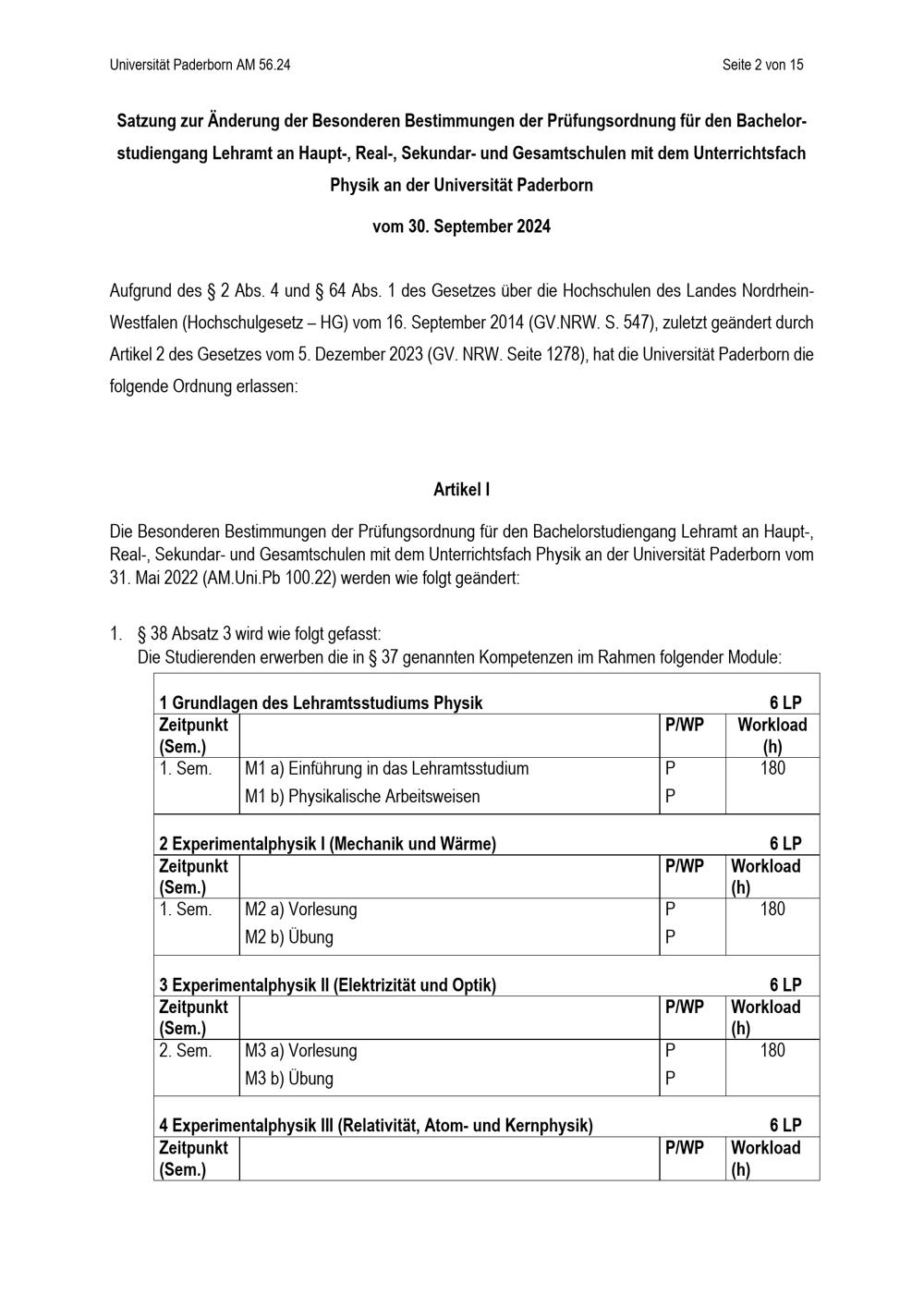Satzung zur Änderung der Besonderen Bestimmungen der Prüfungsordnung für den Bachelorstudiengang Lehramt an Haupt-, Real-, Sekundar- und Gesamtschulen mit dem Unterrichtsfach Physik an der Universität Paderborn : vom 30. September 2024