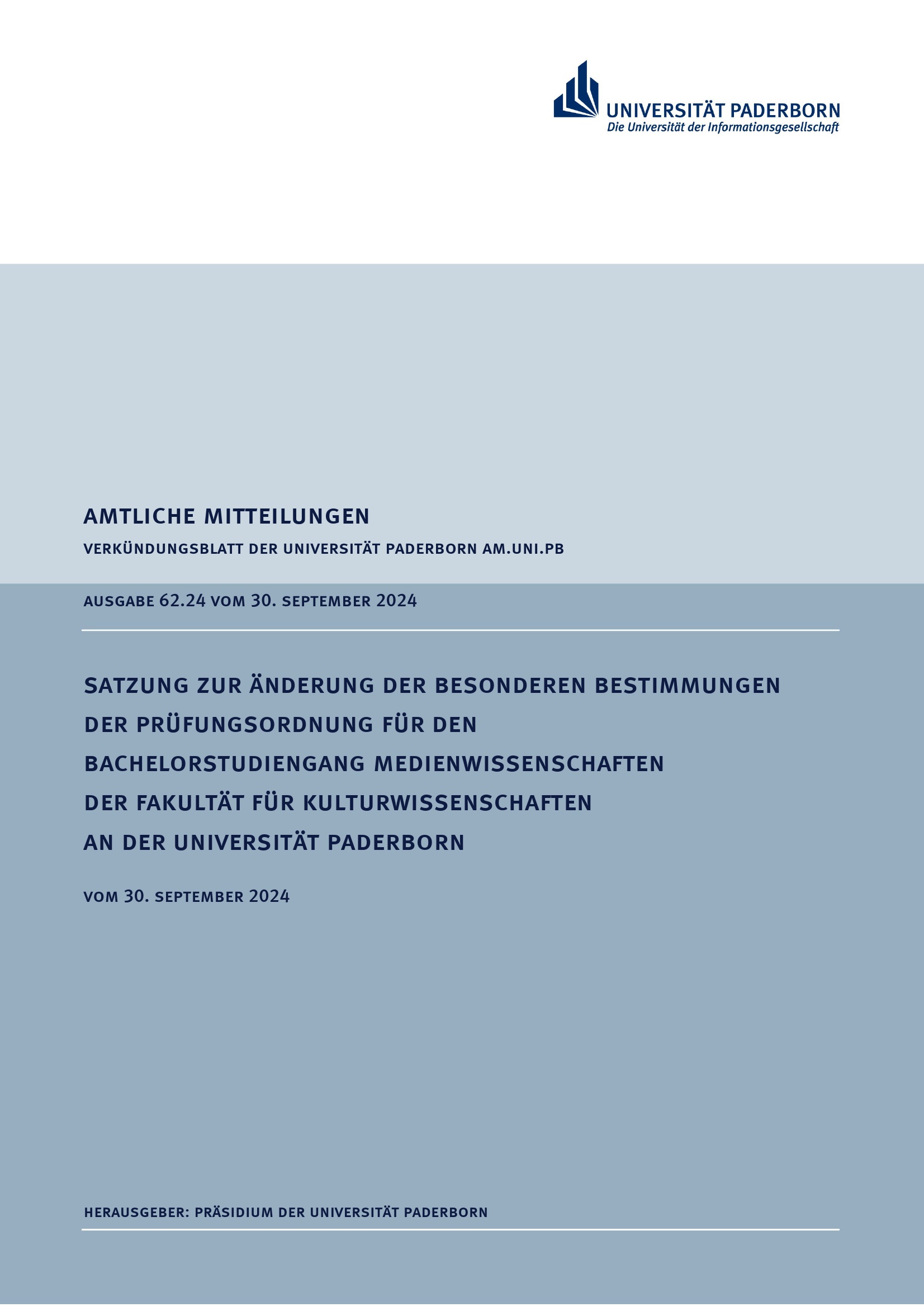 Satzung zur Änderung der Besonderen Bestimmungen der Prüfungsordnung für den Bachelorstudiengang Medienwissenschaften der Fakultät für Kulturwissenschaften an der Universität Paderborn : vom 30. September 2024