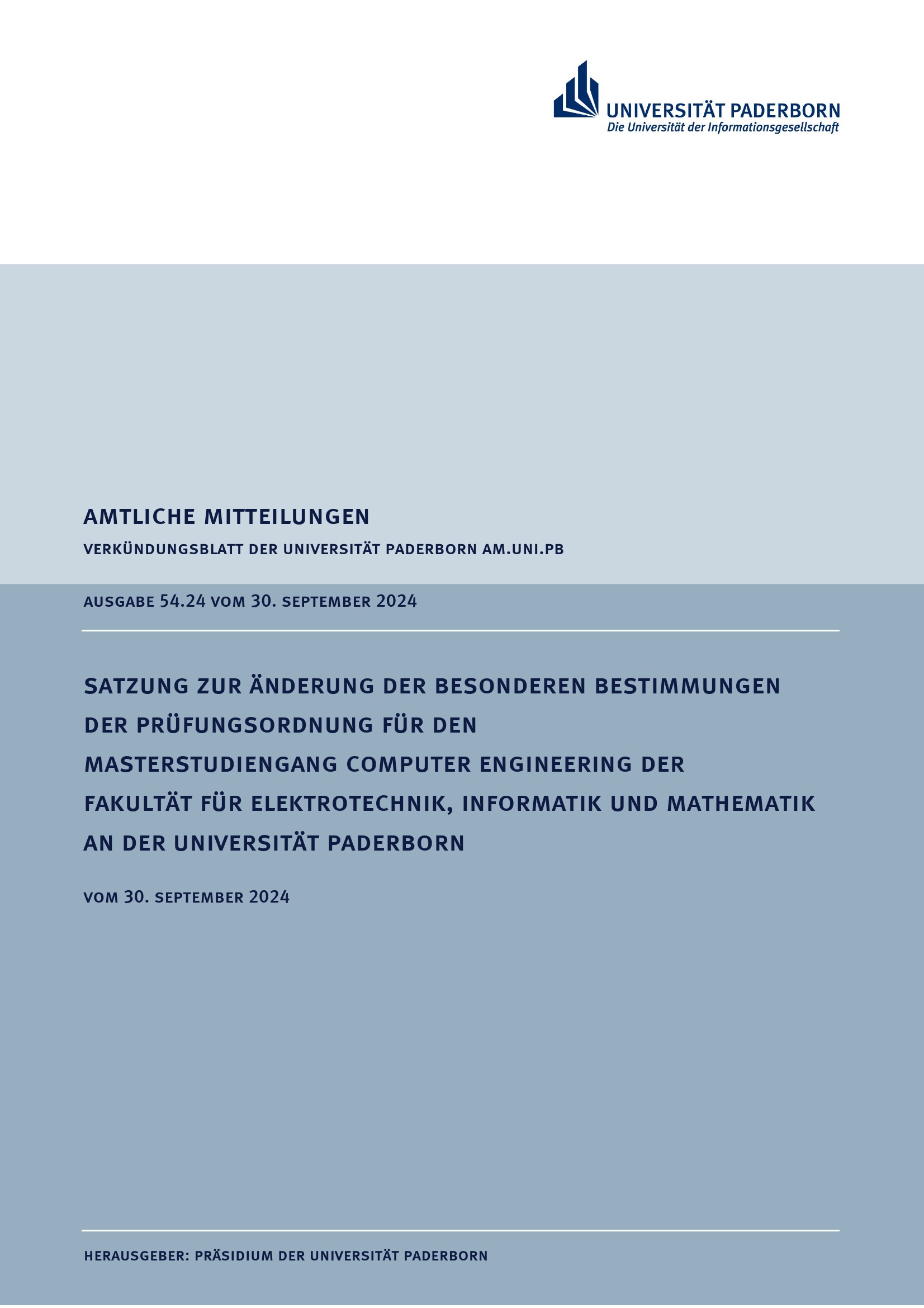 Satzung zur Änderung der Besonderen Bestimmungen der Prüfungsordnung für den Masterstudiengang Computer Engineering der Fakultät für Elektrotechnik, Informatik und Mathematik an der Universität Paderborn : vom 30. September 2024