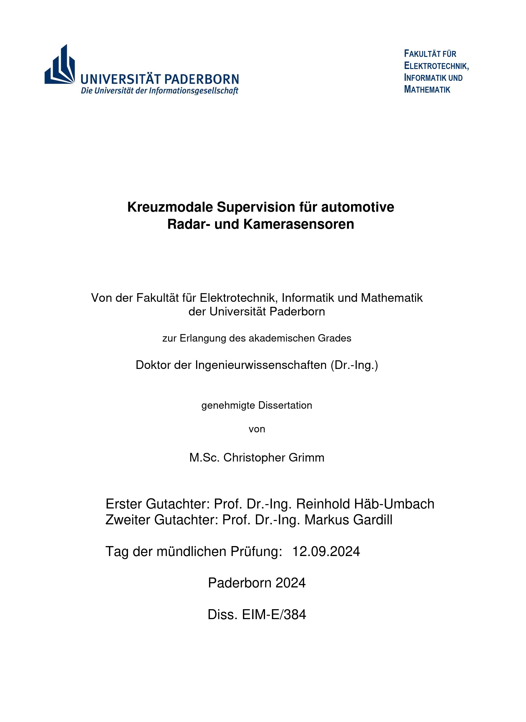Kreuzmodale Supervision für automotive Radar- und Kamerasensoren / von M.Sc. Christopher Grimm ; Erster Gutachter: Prof. Dr.-Ing. Reinhold Häb-Umbach, Zweiter Gutachter: Prof. Dr.-Ing. Markus Gardill