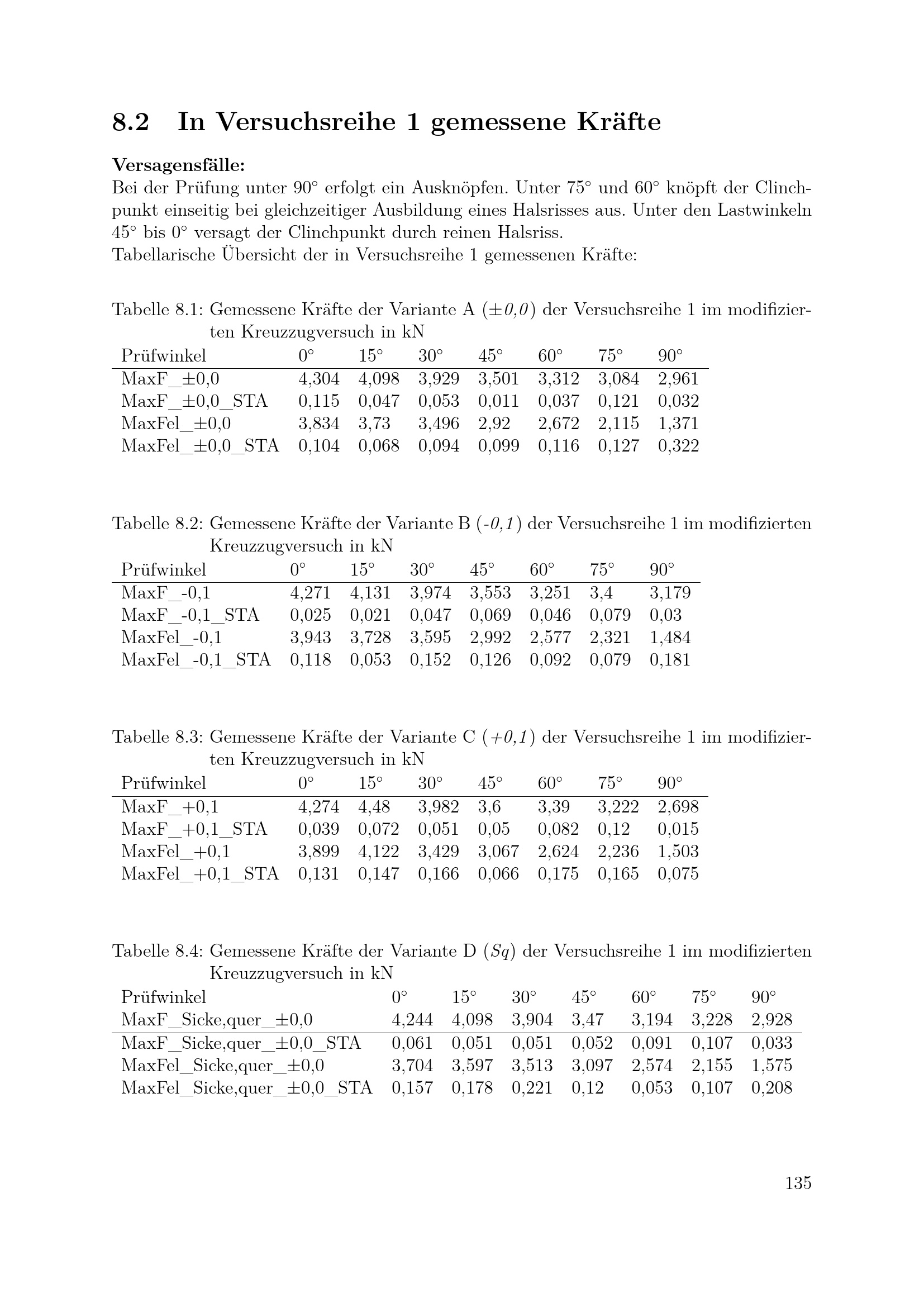 In Versuchsreihe 1 gemessene Kräfte