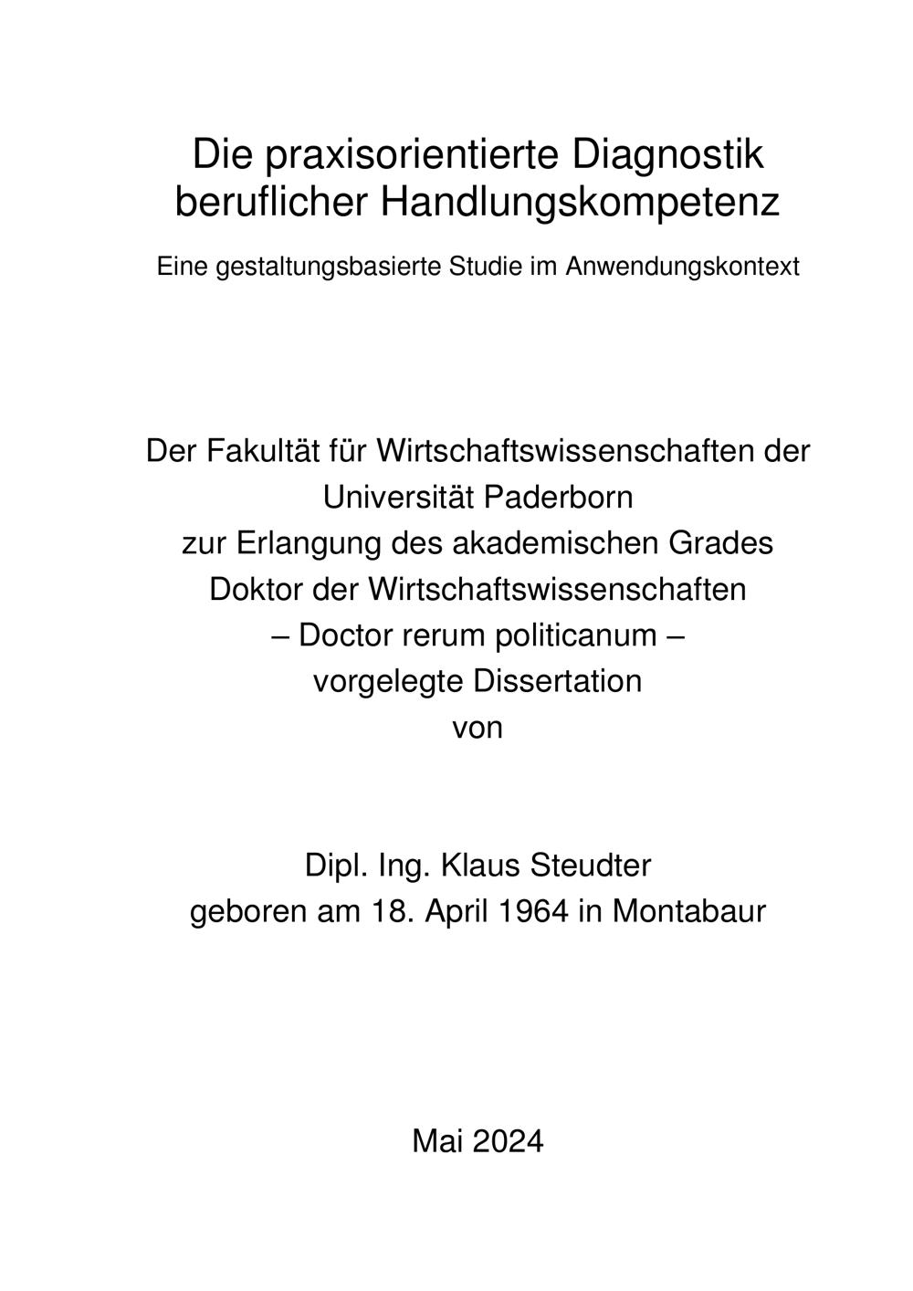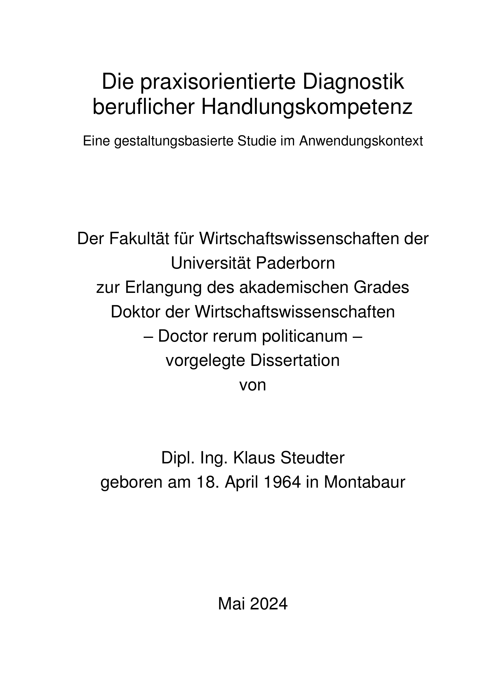 Die praxisorientierte Diagnostik beruflicher Handlungskompetenz : eine gestaltungsbasierte Studie im Anwendungskontext / Dipl. Ing. Klaus Steudter