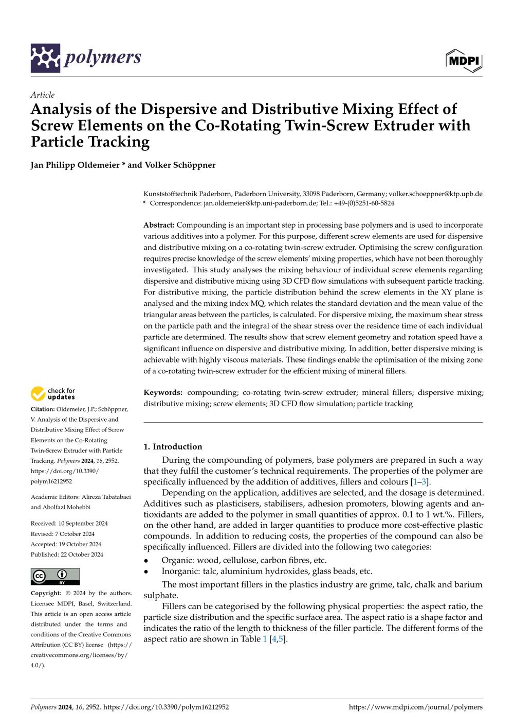 Analysis of the dispersive and distributive mixing effect of screw elements on the co-rotating twin-screw extruder with particle tracking / Jan Philipp Oldemeier and Volker Schöppner
