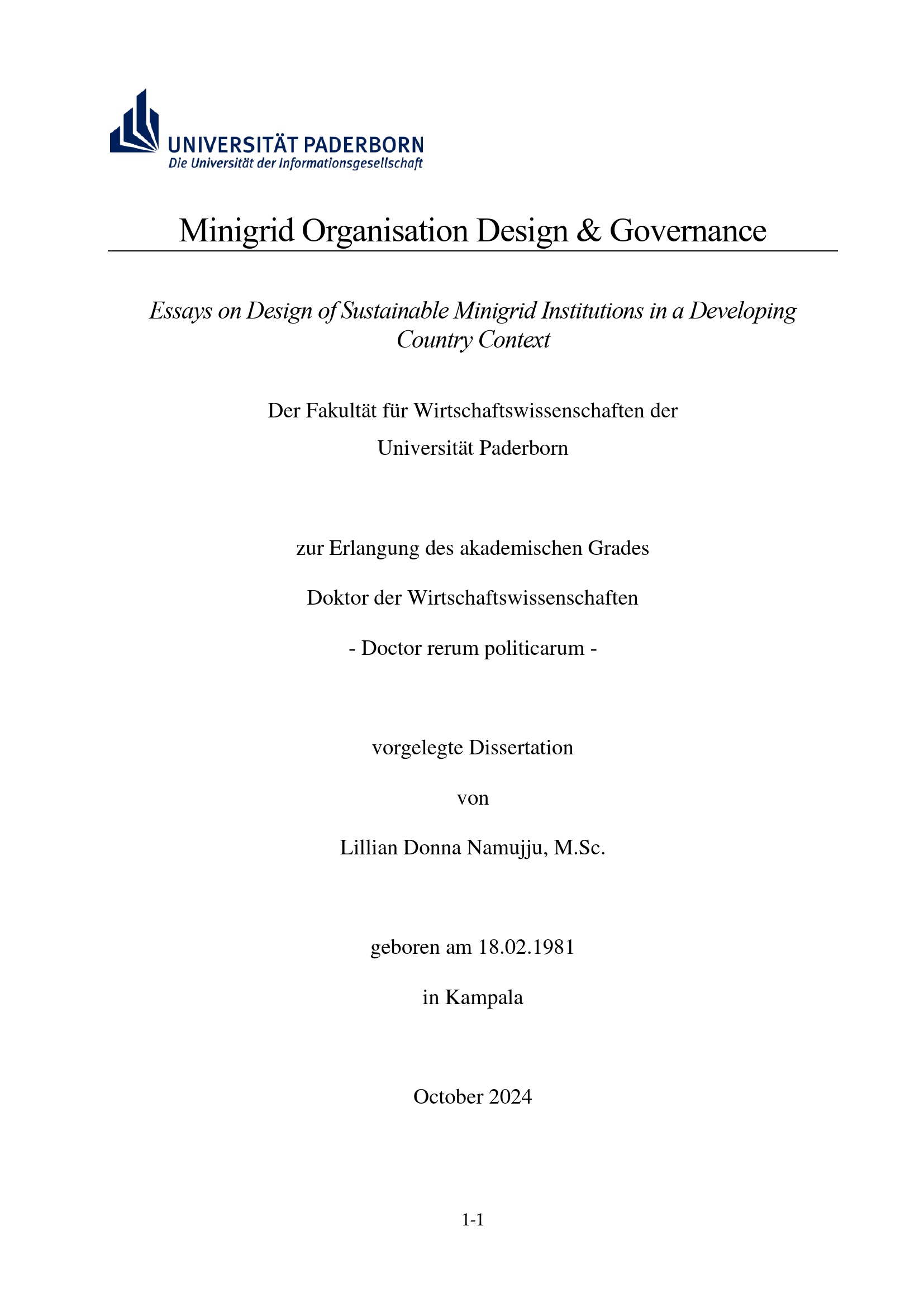 Minigrid organisation design & governance : essays on design of sustainable minigrid institutions in a developing country context / von Lillian Donna Namujju, M.Sc.