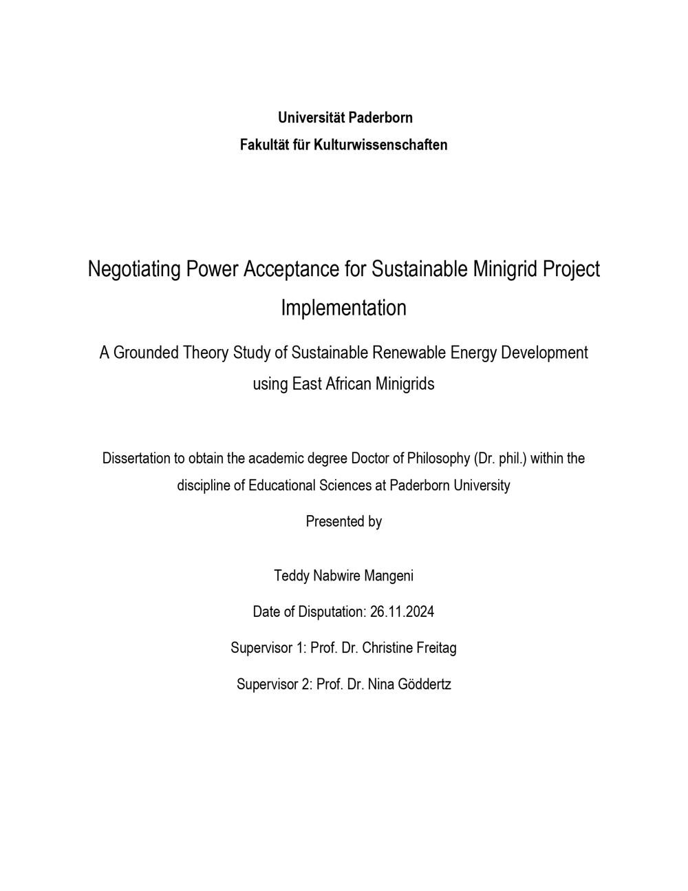 Negotiating power acceptance for sustainable minigrid project implementation : a grounded theory study of sustainable renewable energy development using East African minigrids = Aushandlung der Machtakzeptanz für die Umsetzung eines nachhaltigen Minigrid-Projekts : eine Grounded Theory-Studie zur Entwicklung nachhaltiger erneuerbarer Energien unter Verwendung ostafrikanischer Minigrids / Teddy Nabwire Mangeni ; Supervisor 1: Prof. Dr. Christine Freitag, Supervisor 2: Prof. Dr. Nina Göddertz