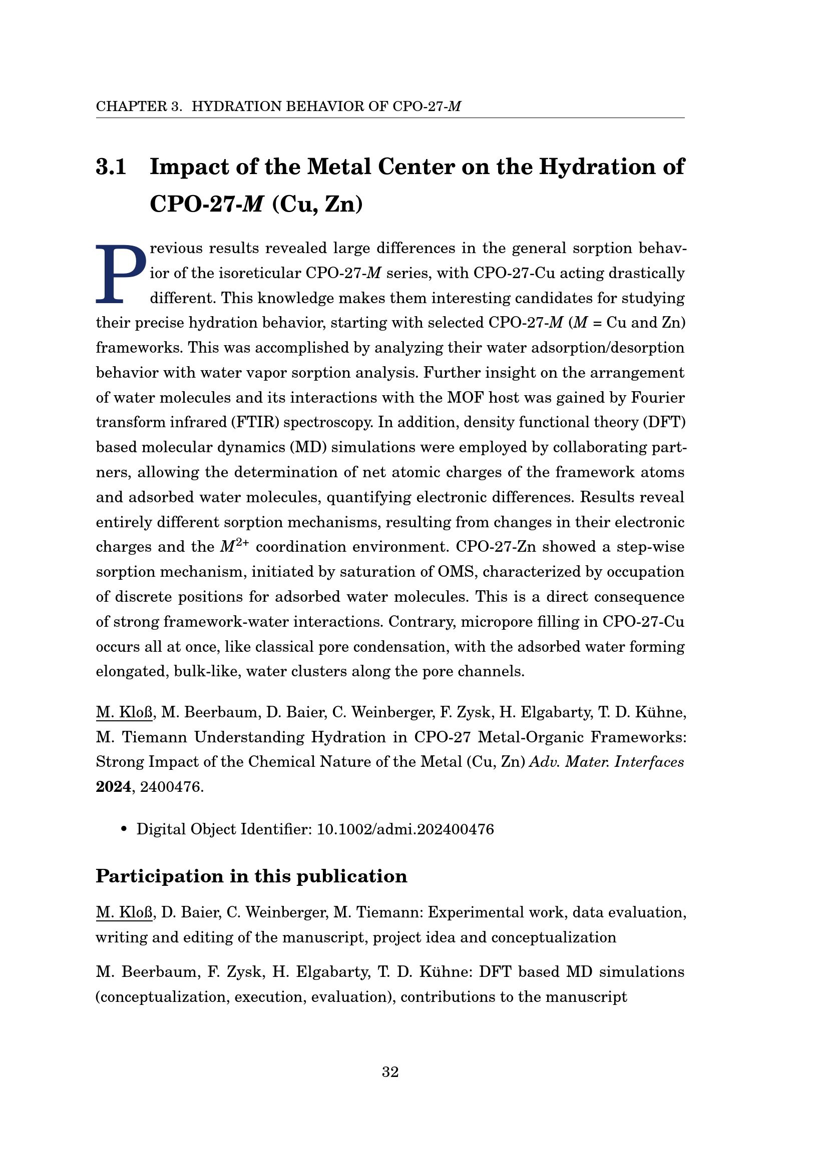 Water under metal-organic framework confinement: systematic studies of the water sorption behavior and water interactions in one-dimensional pores / Marvin Kloß ; [First Reviewer: Prof. Dr. Michael Tiemann, Second Reviewer: Prof. Dr. Sebastian Henke]