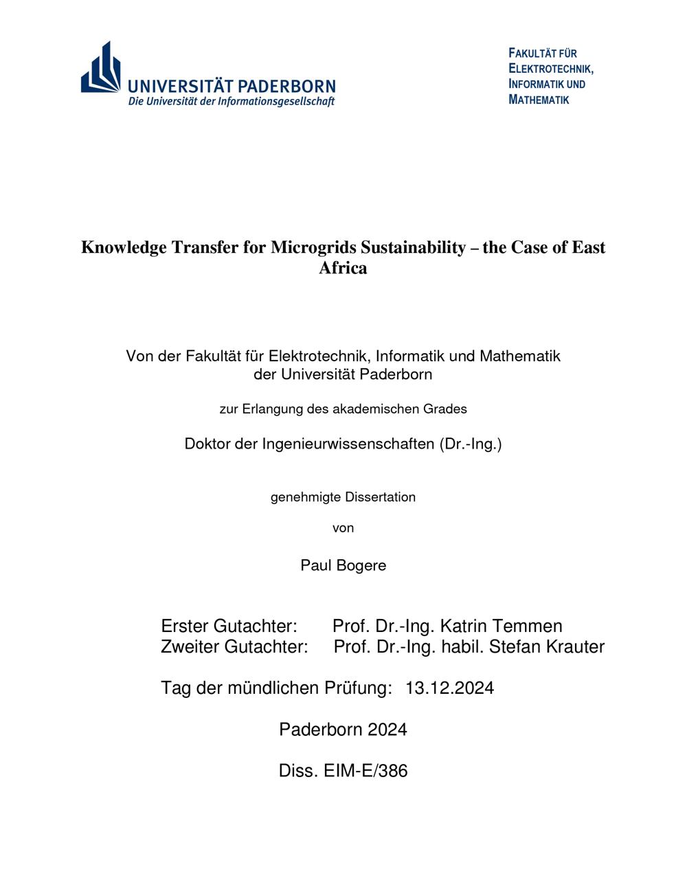 Knowledge transfer for microgrids sustainability – the case of East Africa / Paul Bogere, Erster Gutachter: Prof. Dr.-Ing. Katrin Temmen, Zweiter Gutachter: Prof. Dr.-Ing. habil. Stefan Krauter